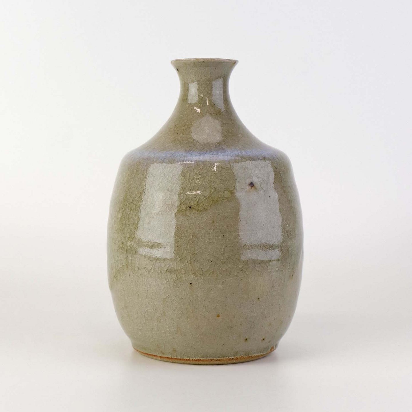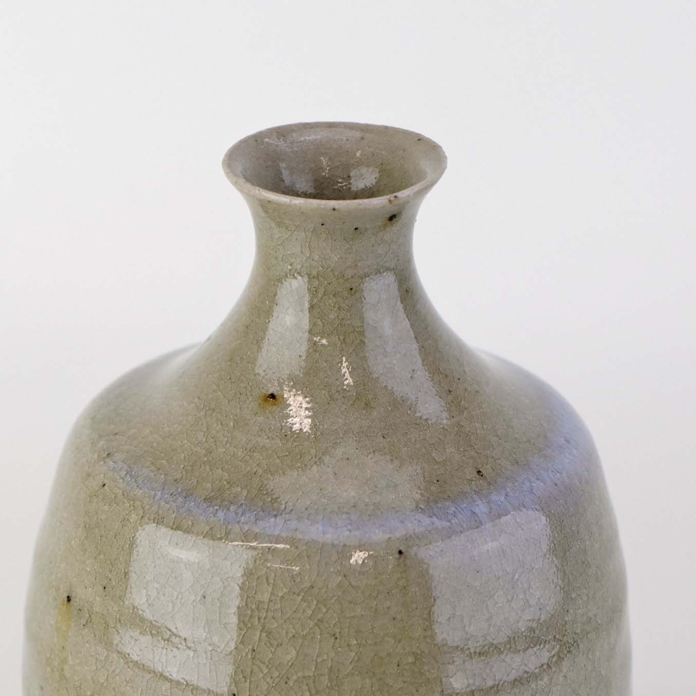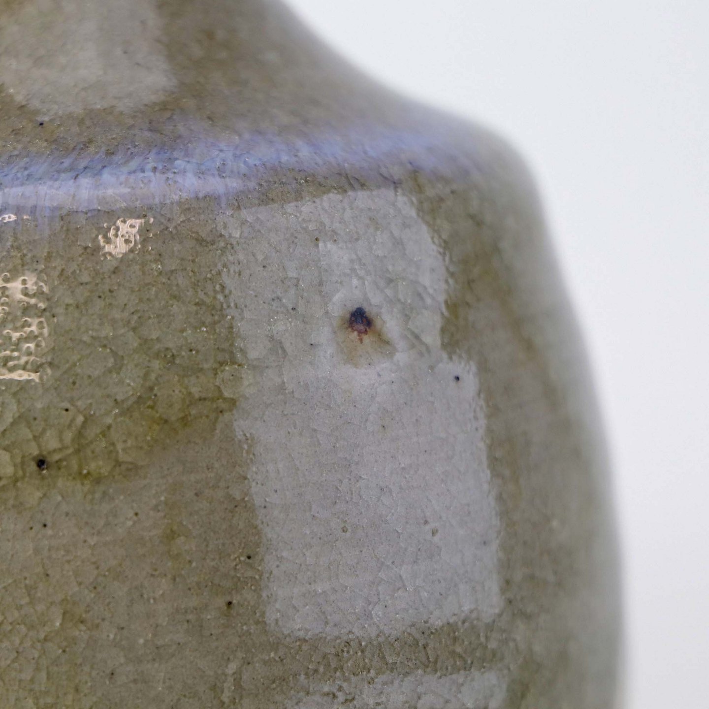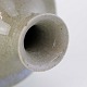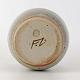 Beskrivelse: Vase i stentøj med beigefarvet glasur med mørke nister og krakkeleringer samt med en fremhævet blå kant.