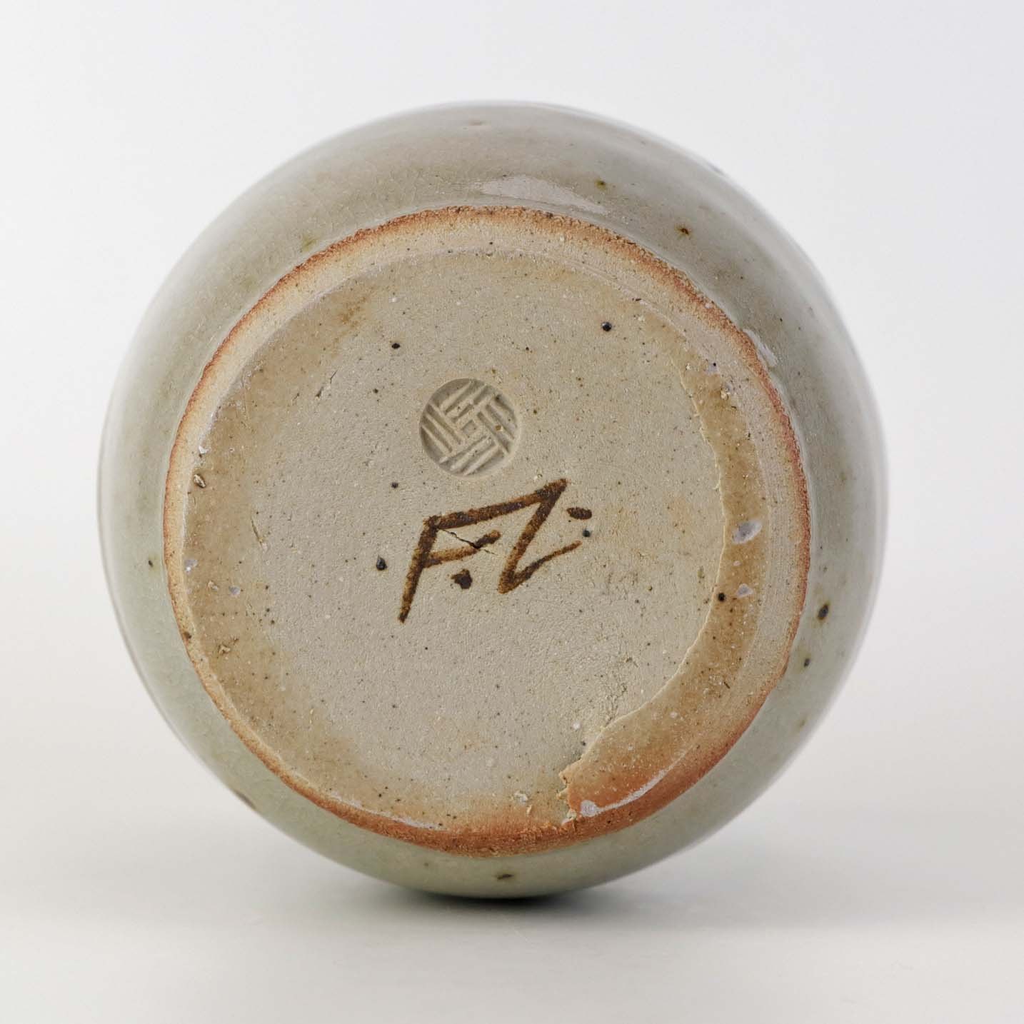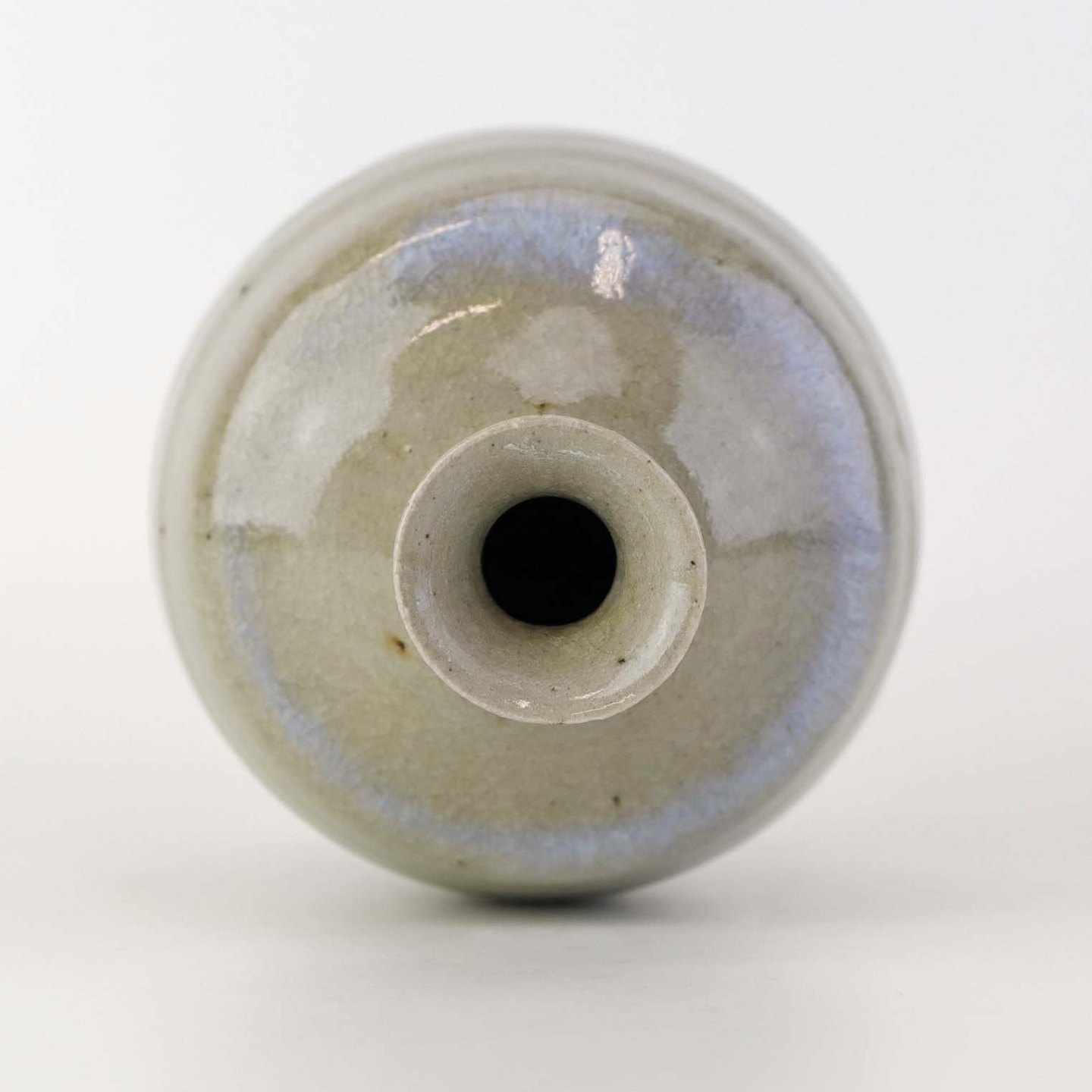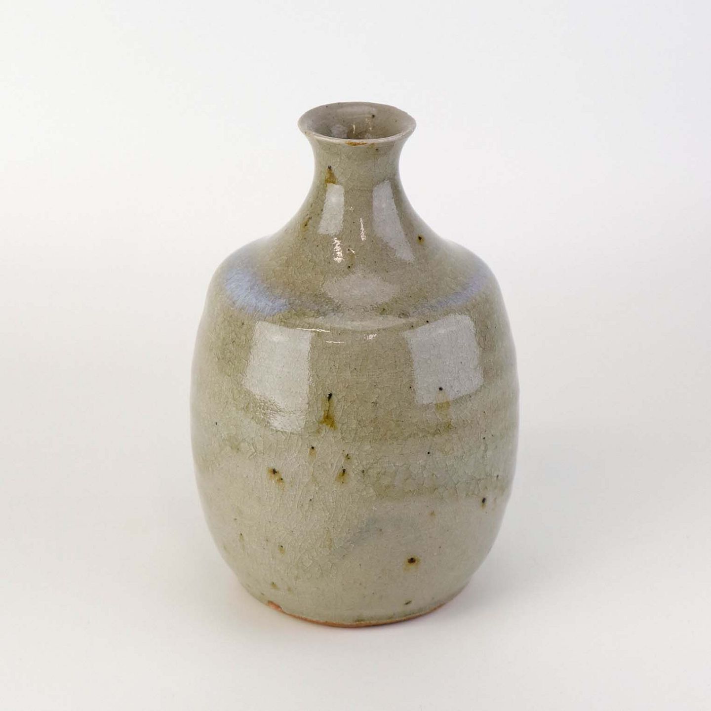 Beskrivelse: Vase i stentøj med beigefarvet glasur med mørke nister og krakkeleringer samt med en fremhævet blå kant.