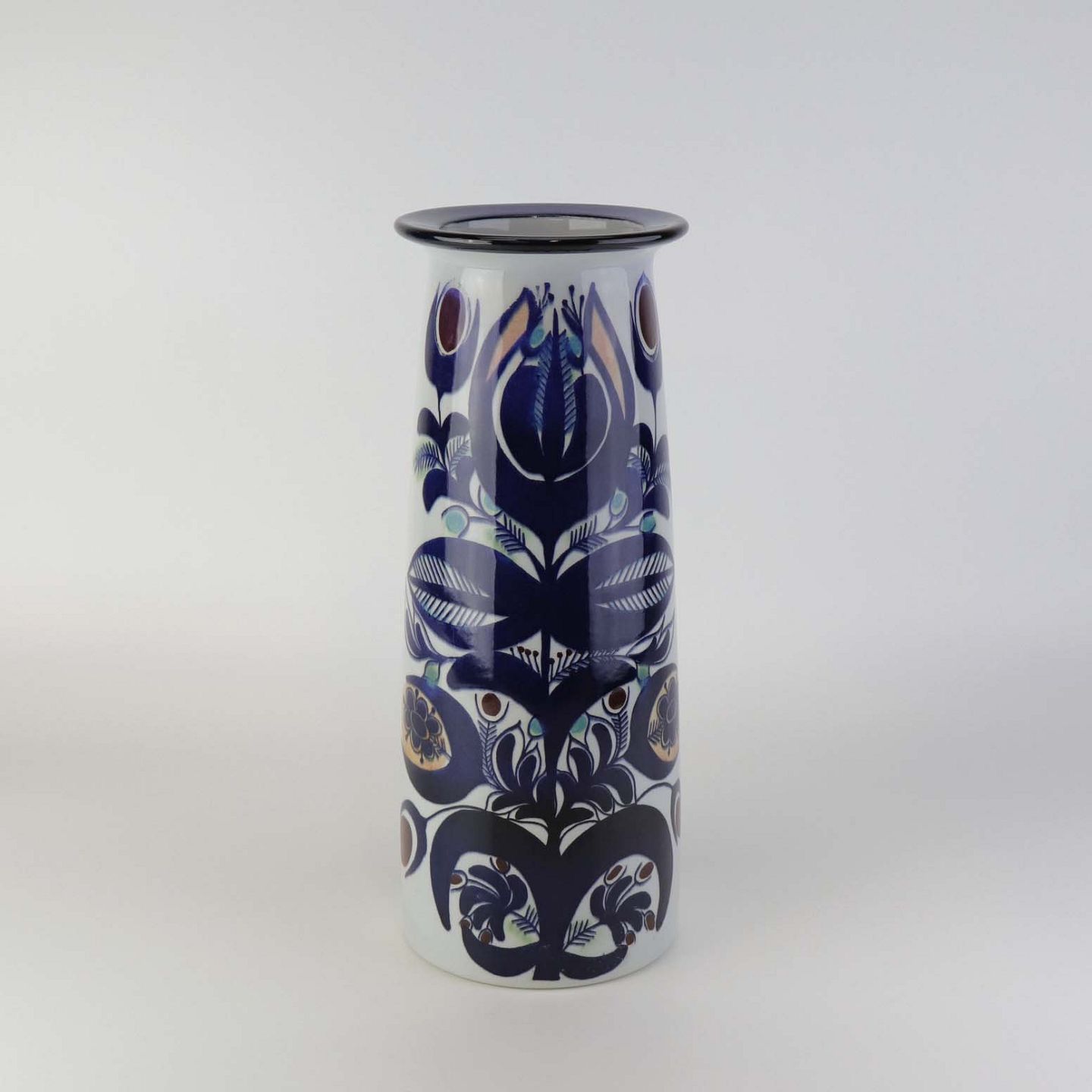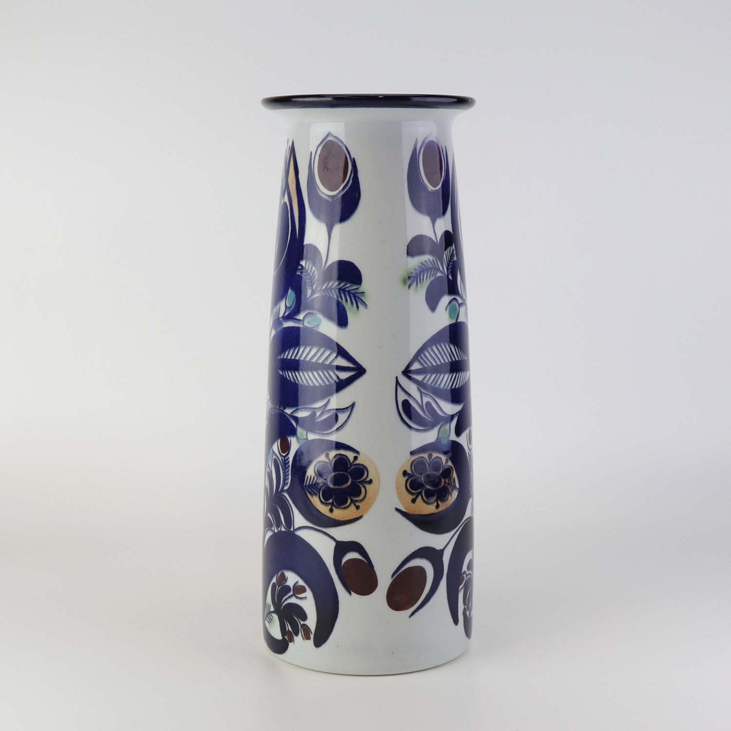 Beskrivelse: Vase i fajance fra Tenera serien med let krakkeleret glasur og blåt abstrakt blomstermønster. Nr. 207/2967
