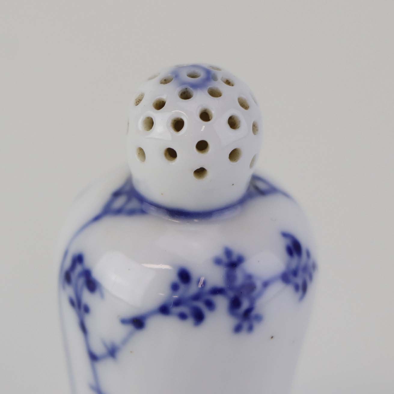 Beskrivelse: Mindre strø til peber i kongelig porcelæn fra stellet Musselmalet riflet. Nr. 1/439