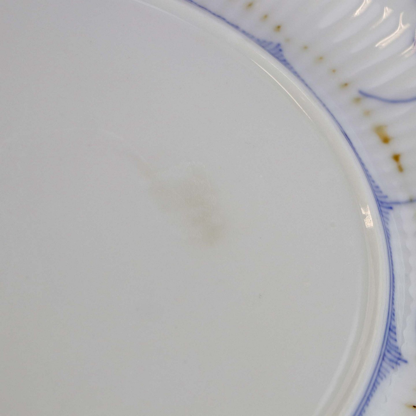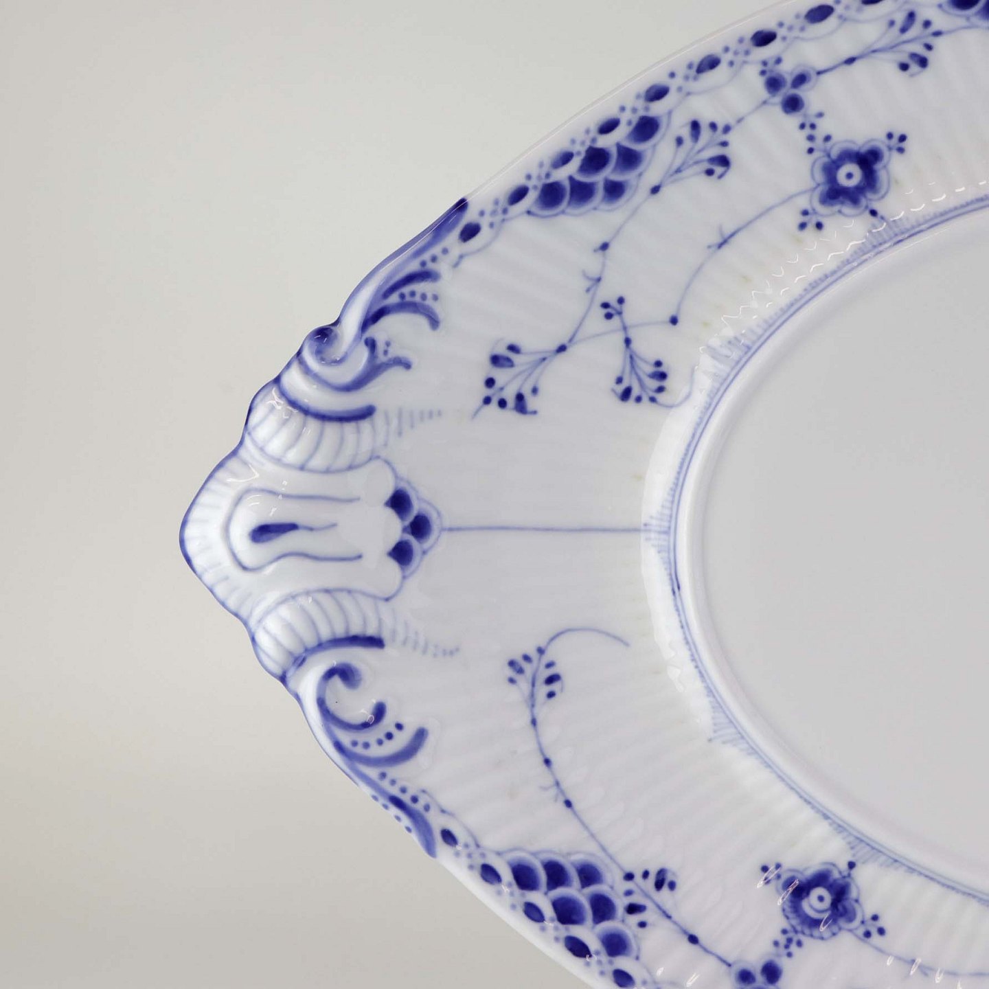 Musselmalet halvblonde er riflet hvidt porcelæn med dekoration af blå ranker og en kant med blonder.