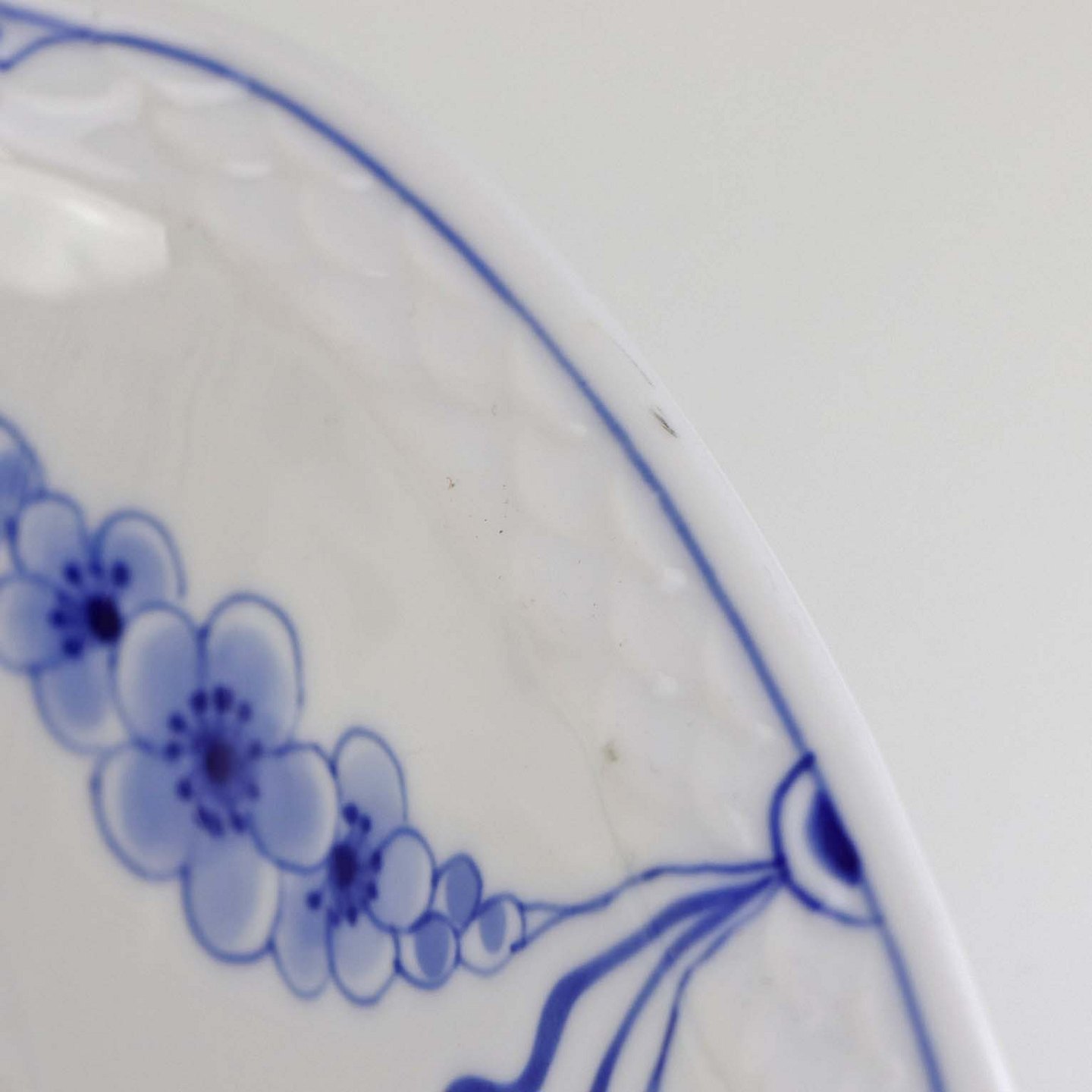 Service i hvidt porcelæn med skelform og motiv af guirlander med blå blomster