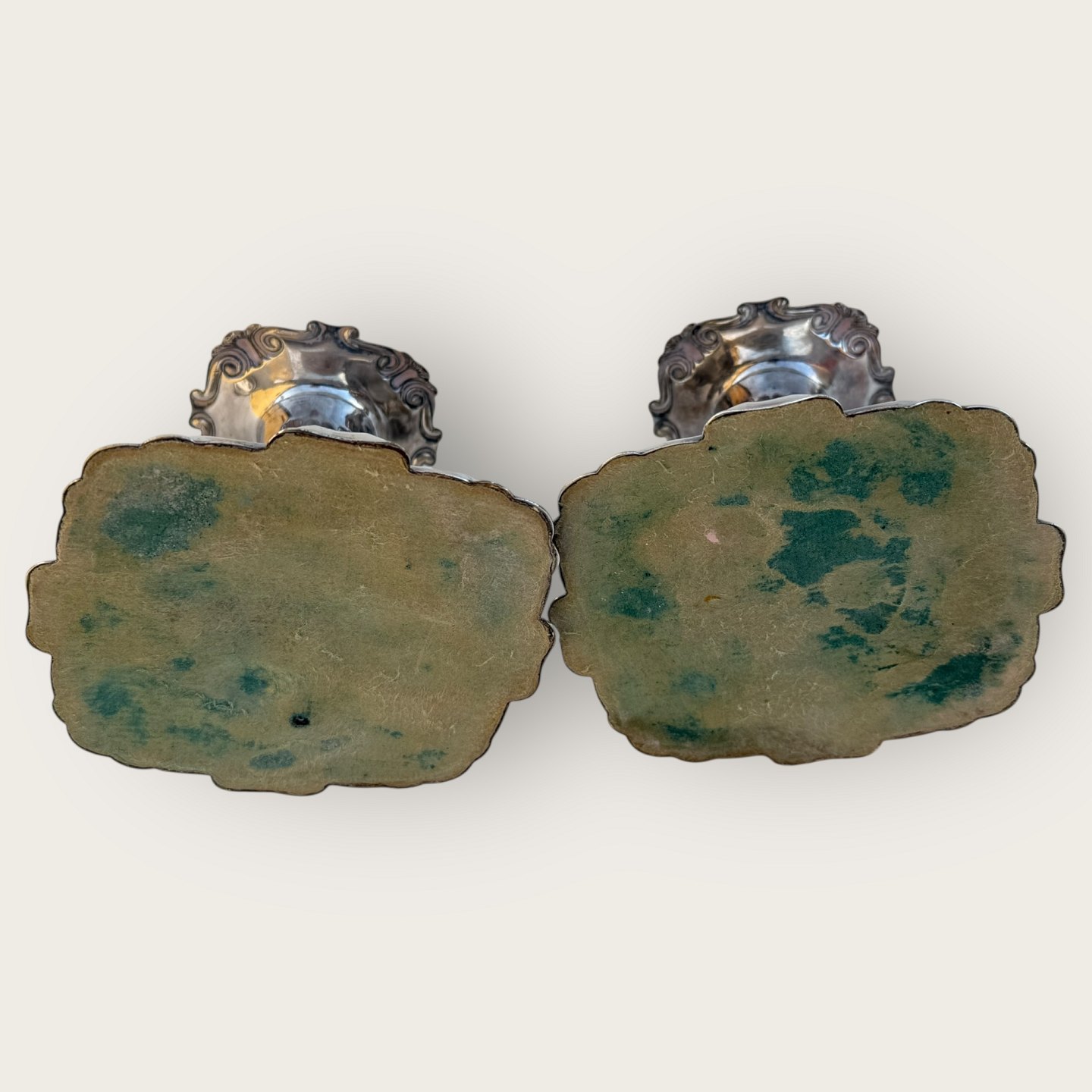 Beskrivelse: Cohr sølvvarefabrik, et par lysestager i sølvplet udfyldte i bunden, højde 6,5cm * Lidt slid på forsølvningen ellers pæn brugt stand*