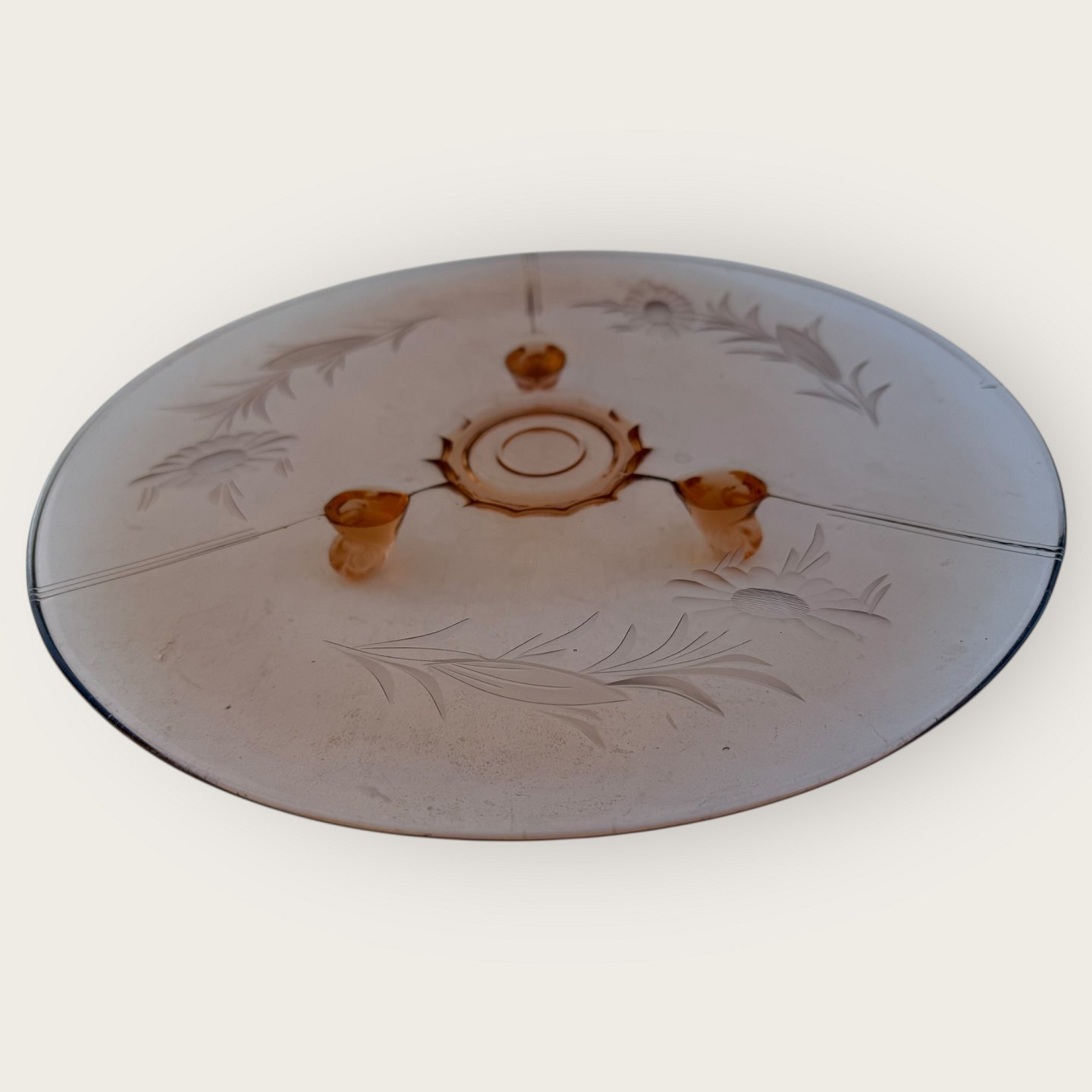 : Rosa glasfad med blomsterslibninger og tre fødder, diameter 29cm *pæn stand*