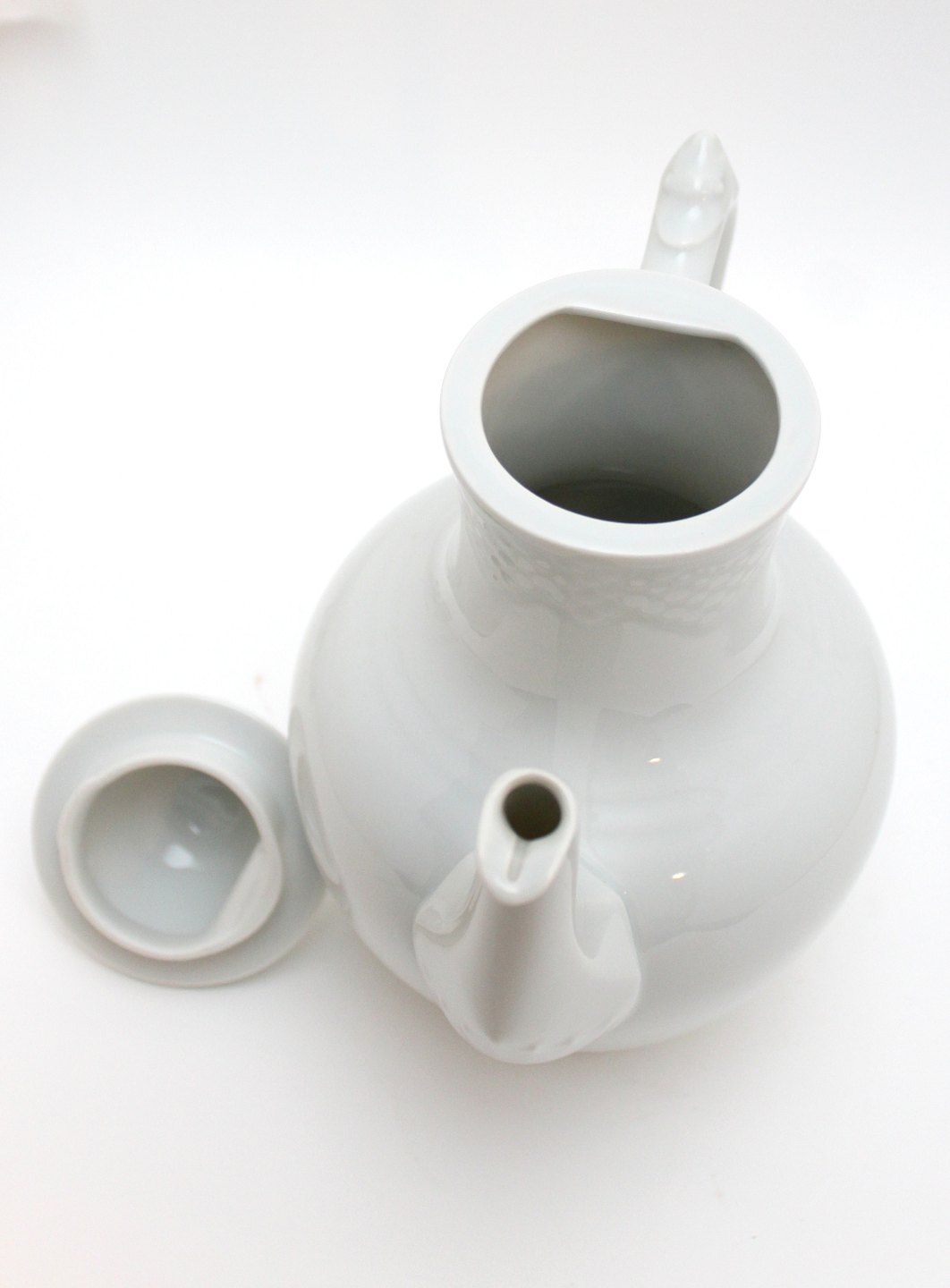 Beskrivelse: Bing & Grøndahl, Elegance. Kaffekande med låg. Hvidt grundstel med vaflet mønster og søheste. Nr. 91A. Produceret i perioden 1962-1970. Højde 25 cm. Største diameter 12 cm. II. sortering. Fin stand. Pris: 225 kr. stk. Lager: 1