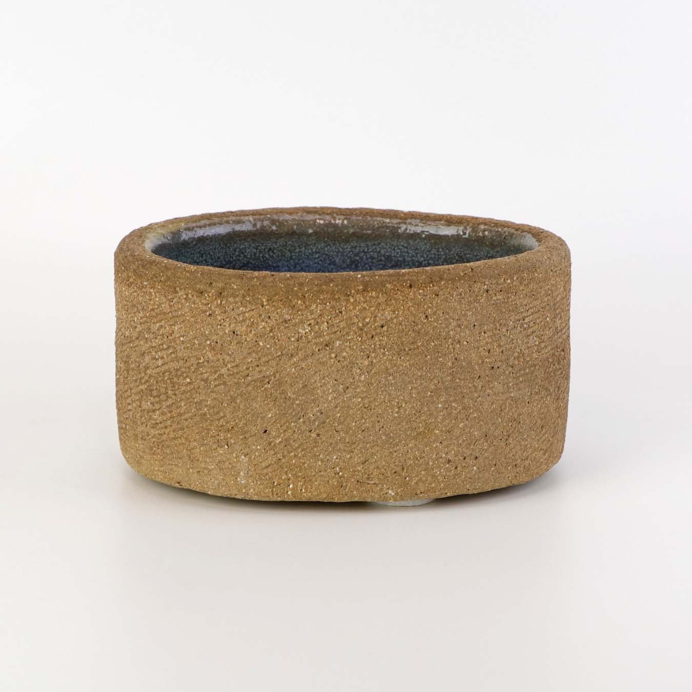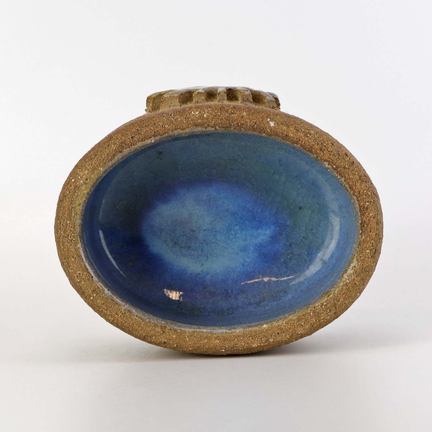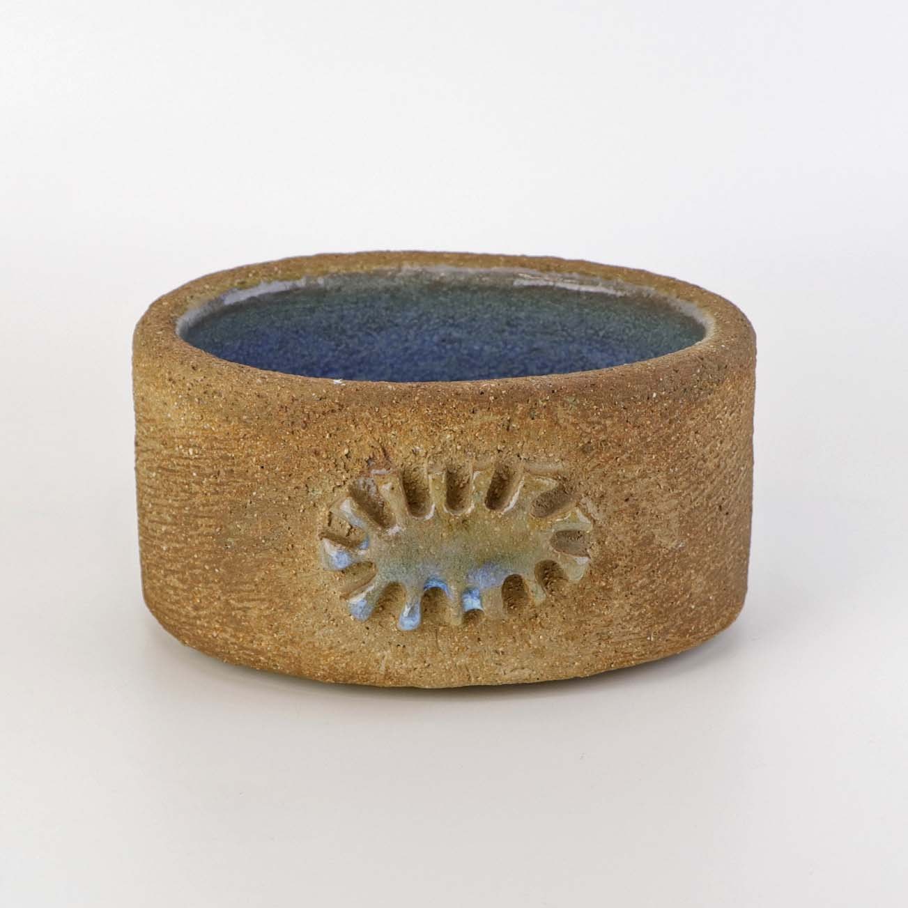 Beskrivelse: Lille oval skål i keramik med lysblå glasur på indersiden samt delvist glaseret sol mønster på ydersiden.
