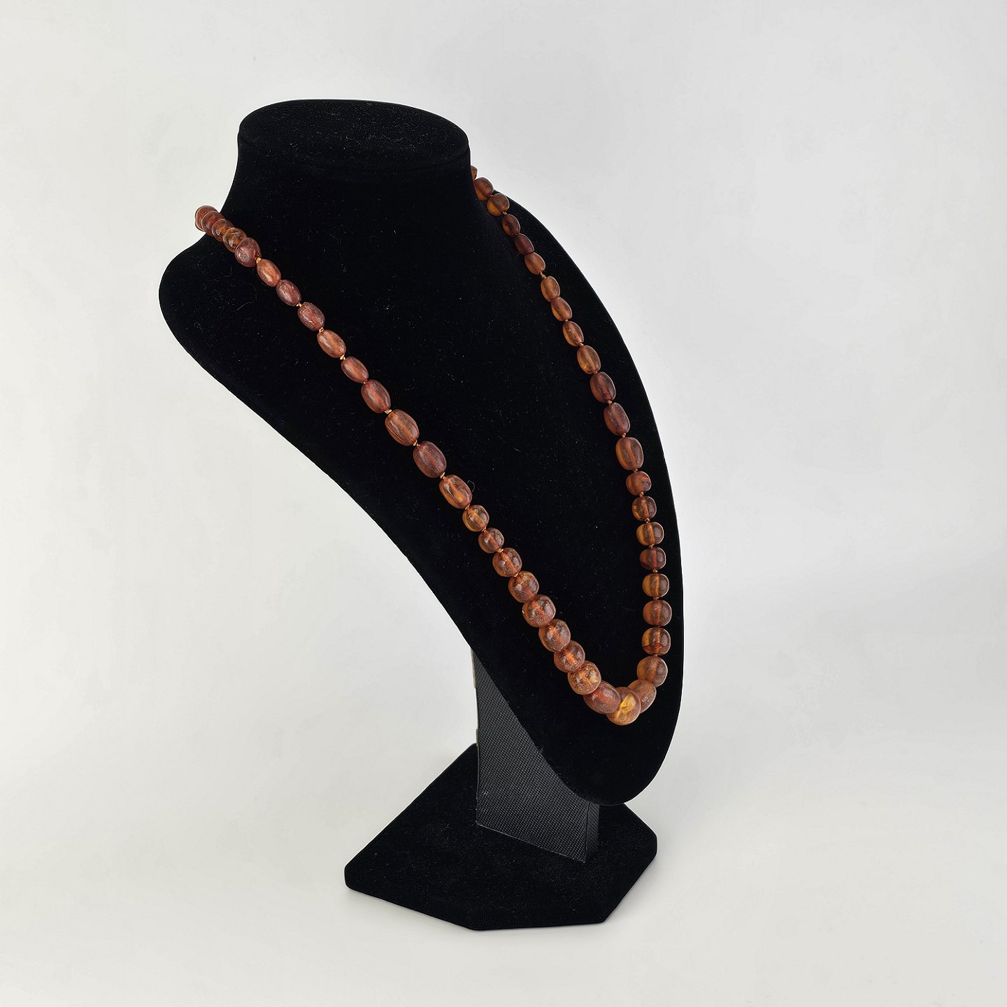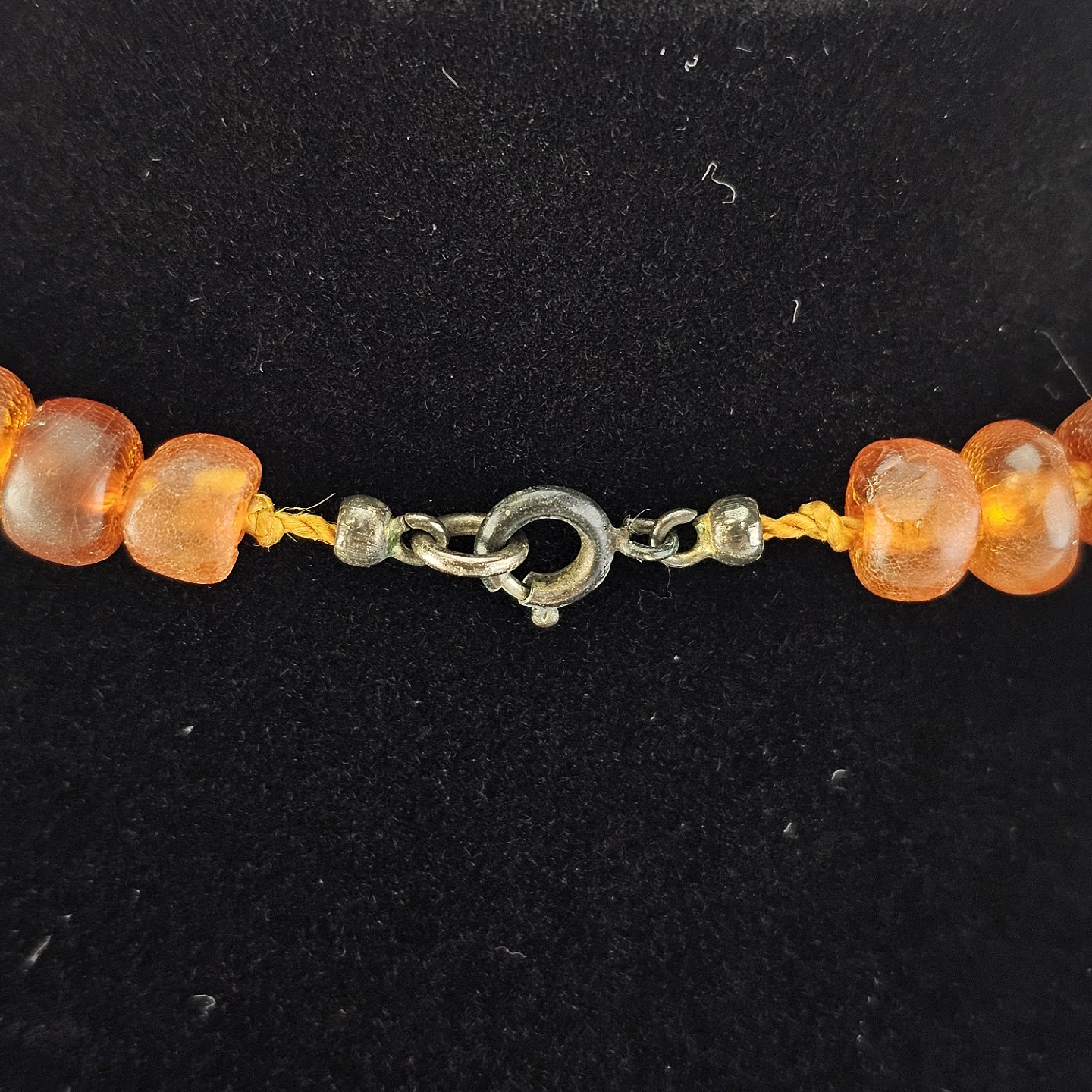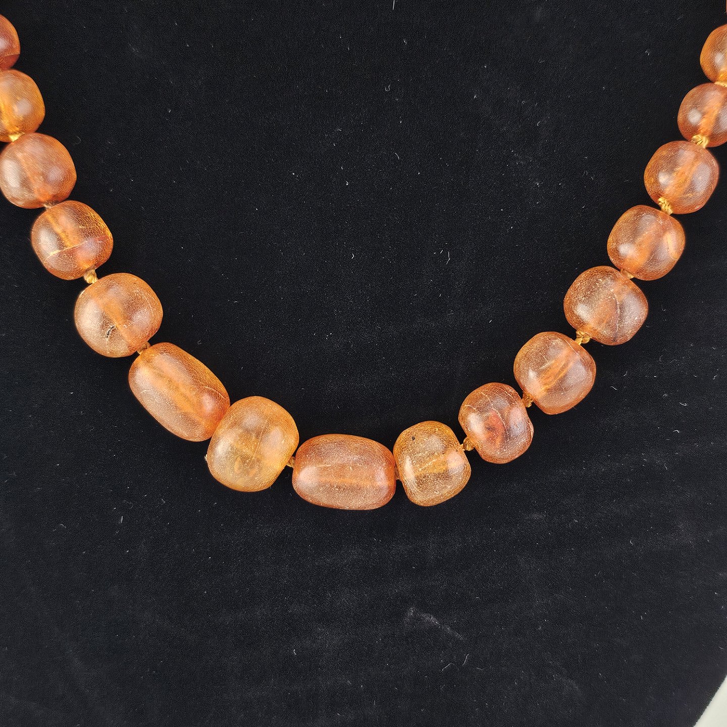 Beskrivelse: Halskæde med glatslebne ravstykker i varierende størrelse på snor, i alt 65 stykker rav