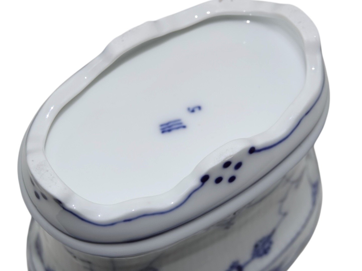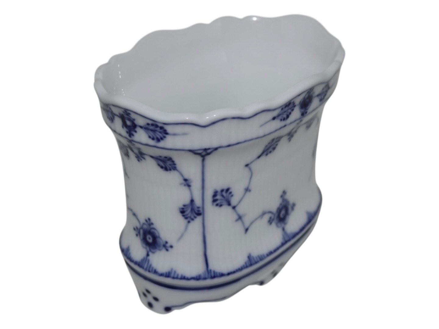 Beskrivelse: Royal Copenhagen Musselmalet Riflet, større cigarbæger.