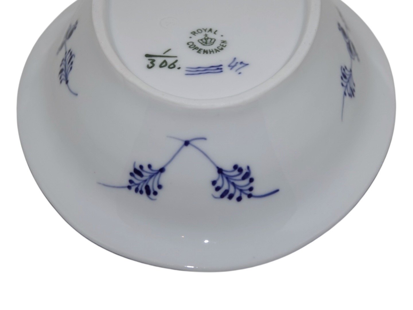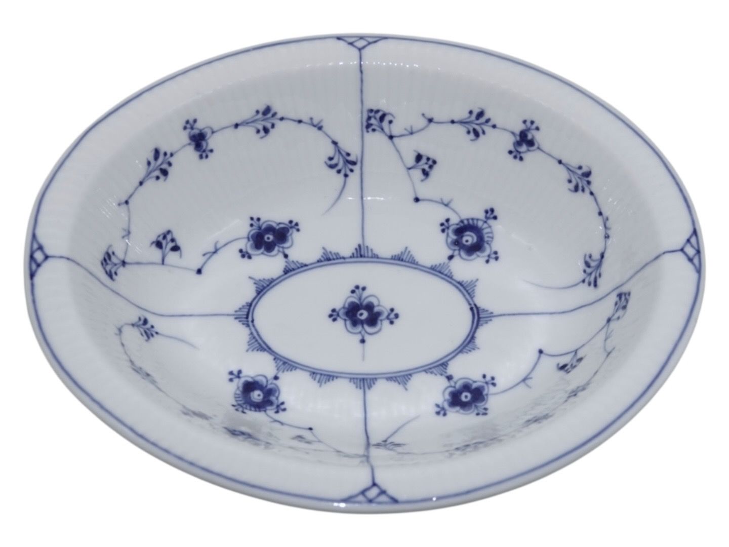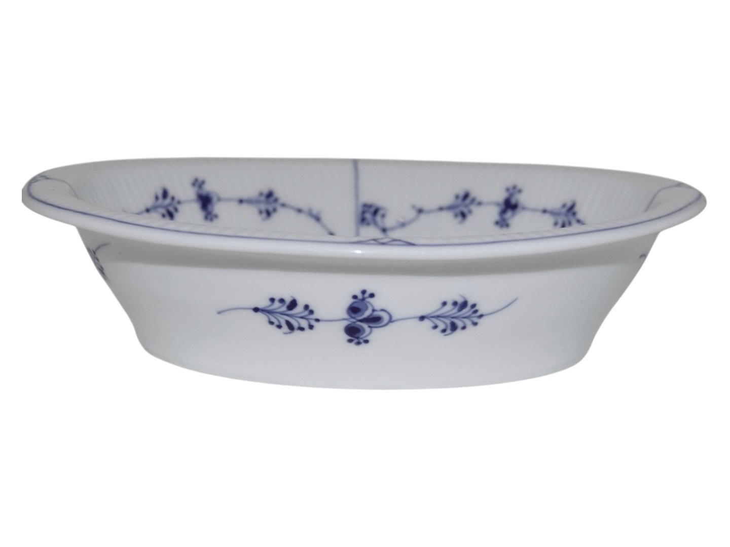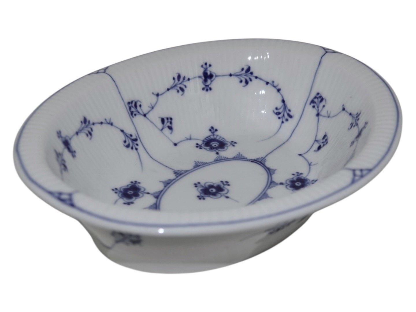 Beskrivelse: Royal Copenhagen Musselmalet Riflet, sjælden lille oval skål.