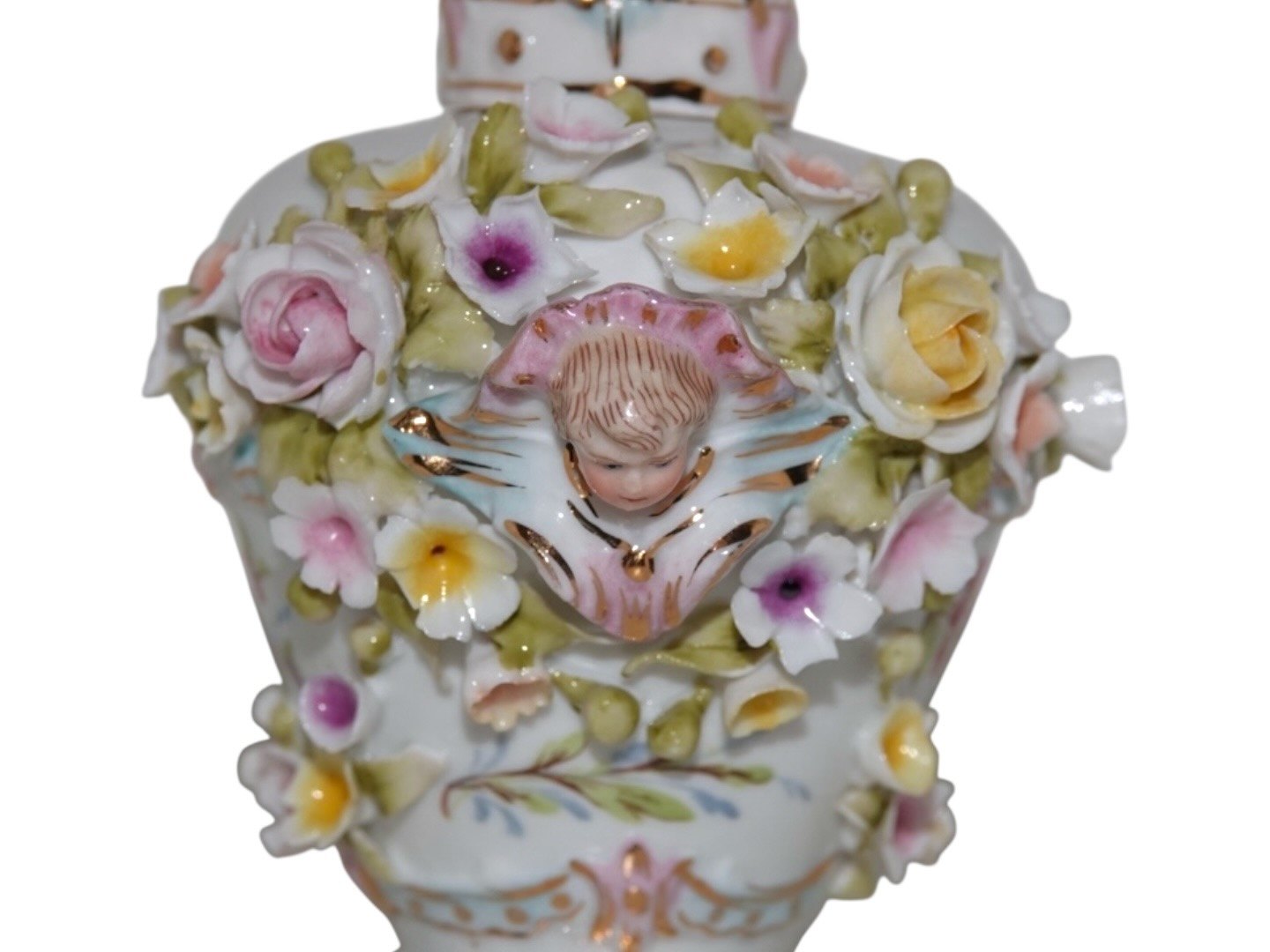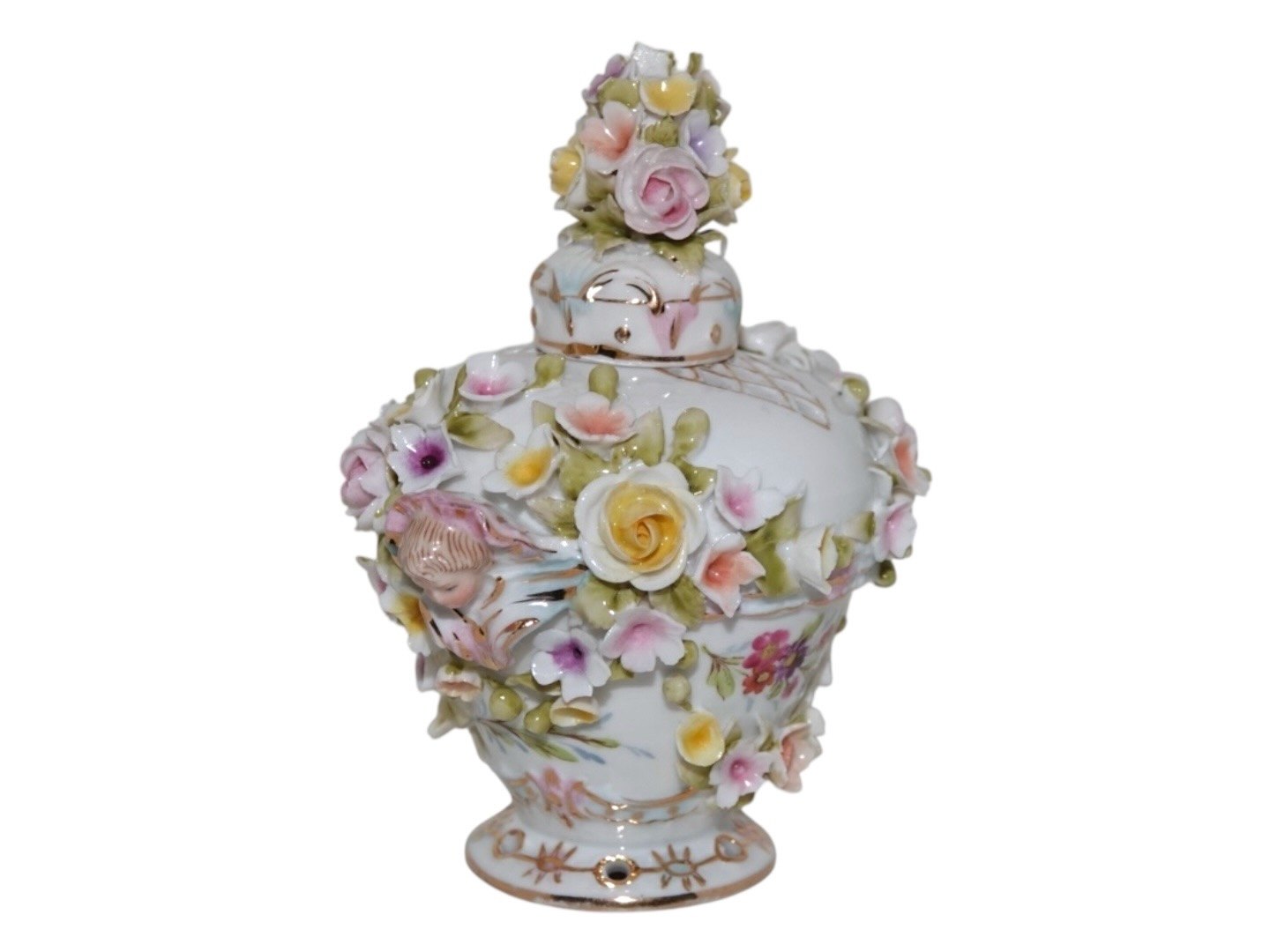 Beskrivelse: Flakon i porcelæn med mange små blomster. Den er formentlig fra Tyskland.