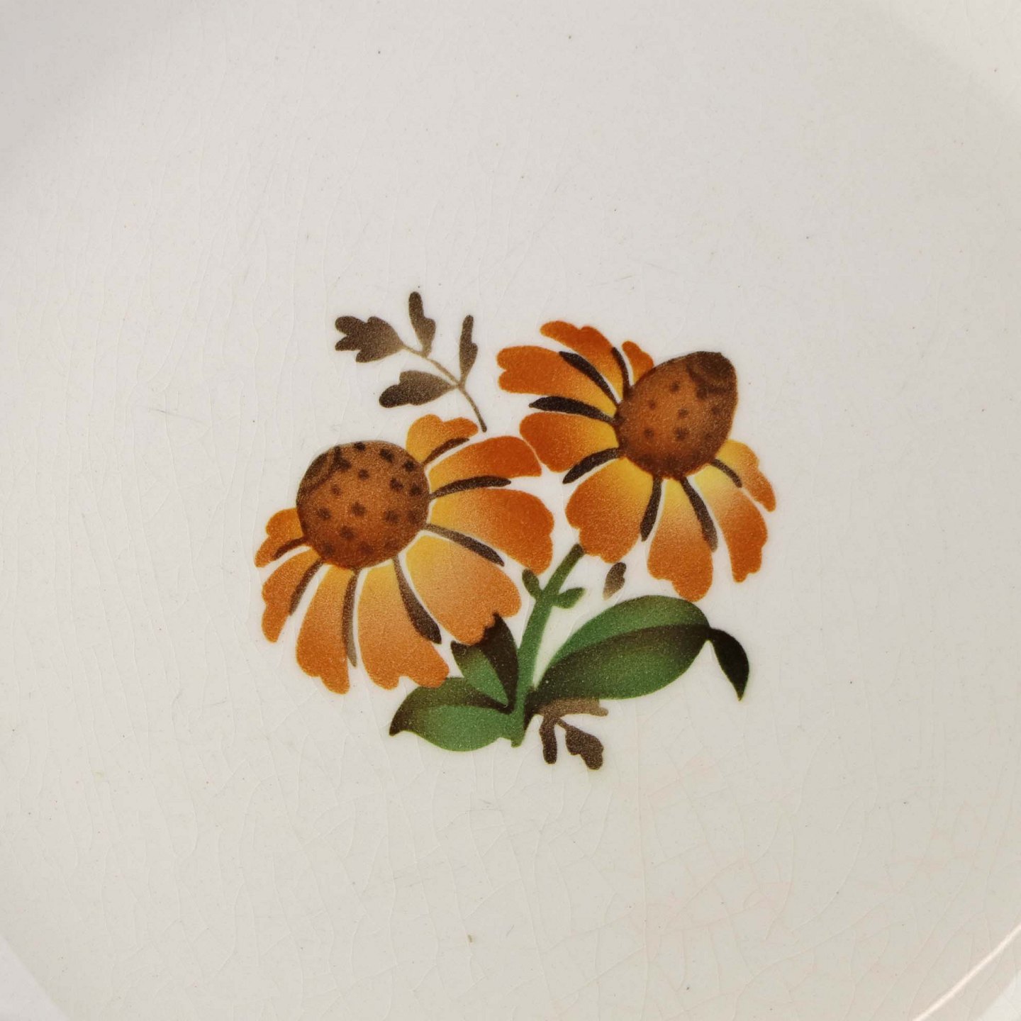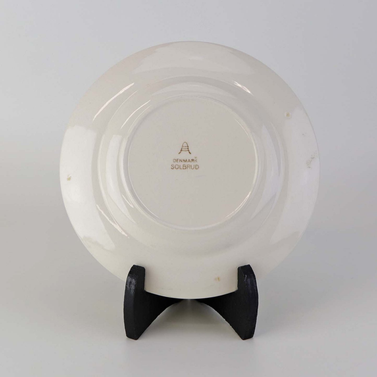 Beskrivelse: Desserttallerken i fajance fra stellet Solbrud fremstillet i perioden 1937-1967
