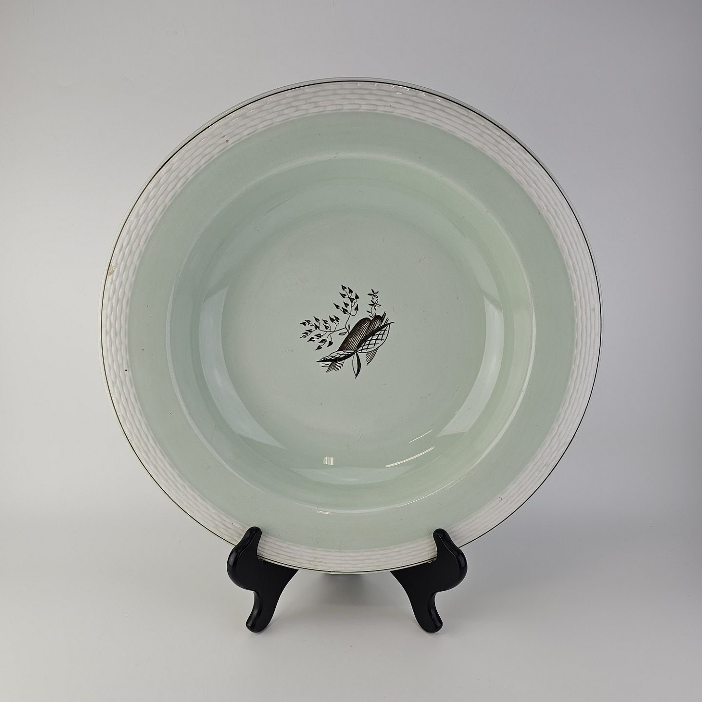Stel i lysegrøn fajance med natur dekoration og flettet kant