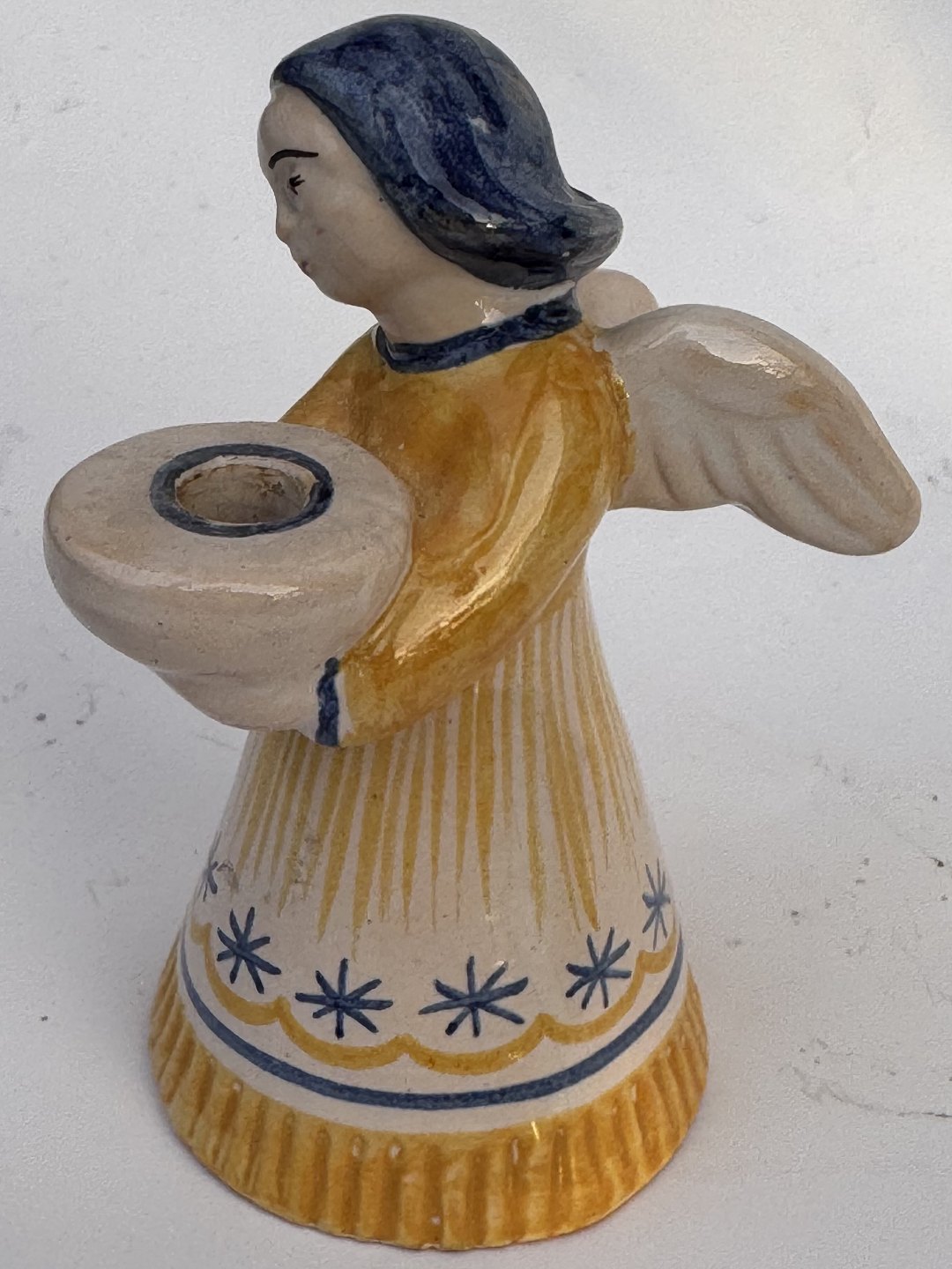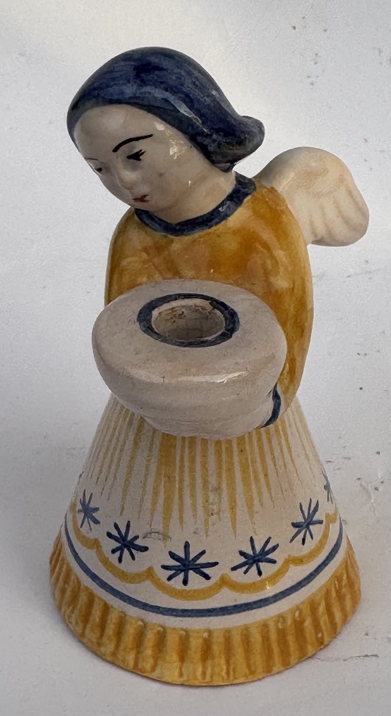 Beskrivelse: ENGEL I GUL KJOLE: Figur af bemalet engel i keramik som lyseholder fra den bornholmske lervarefabrik Lauritz Hjorth. Fremstår i god stand uden skader eller reparationer. Fabriksmærket på bunden. H. 9,5 cm