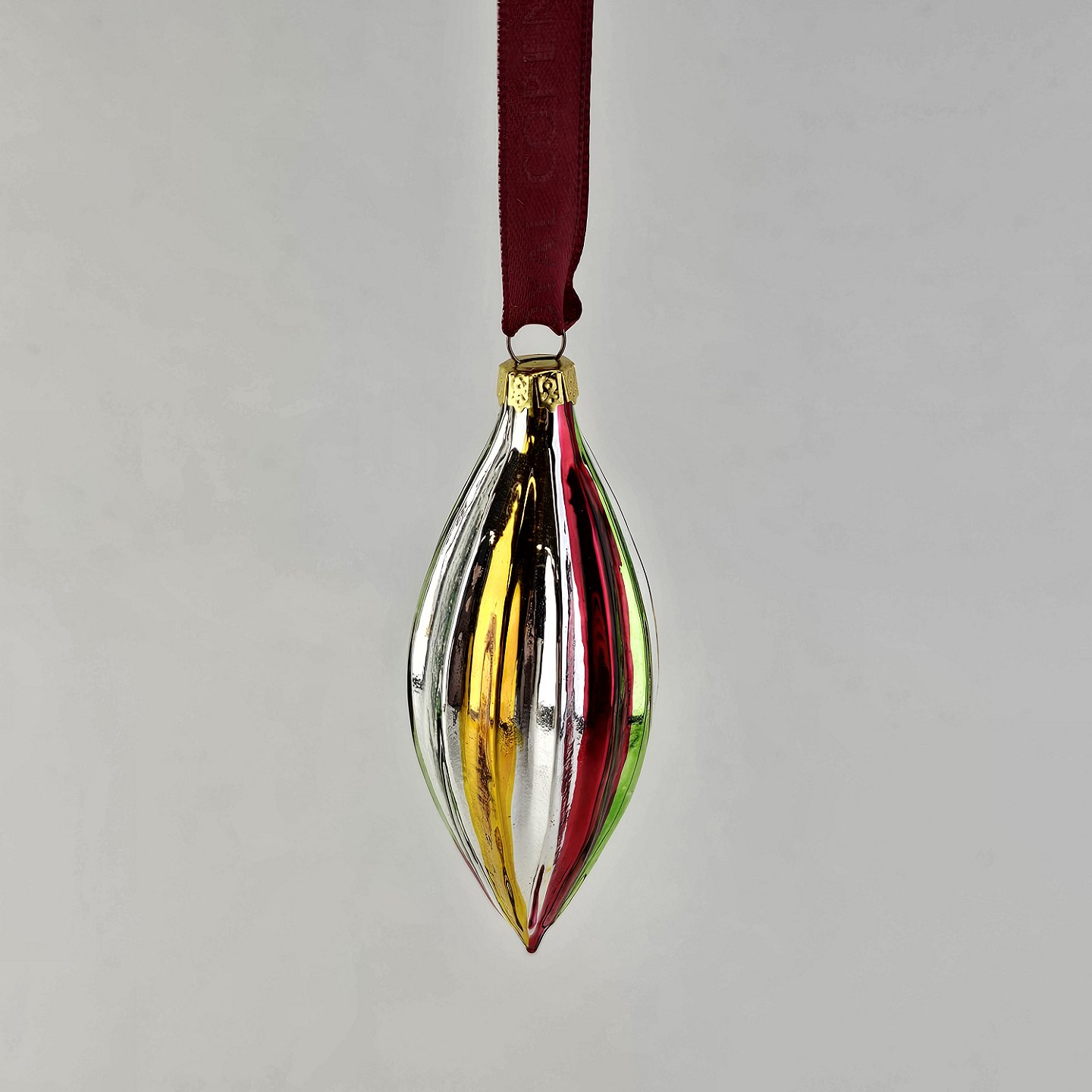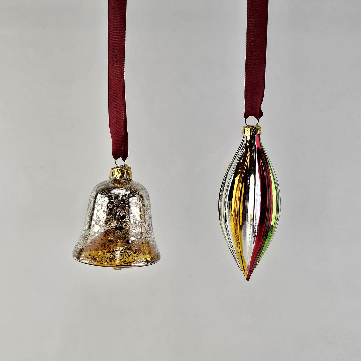 Beskrivelse: Juleornamenter i glas med motiv af en klokke og en aflang julekugle med rødt bånd til ophæng