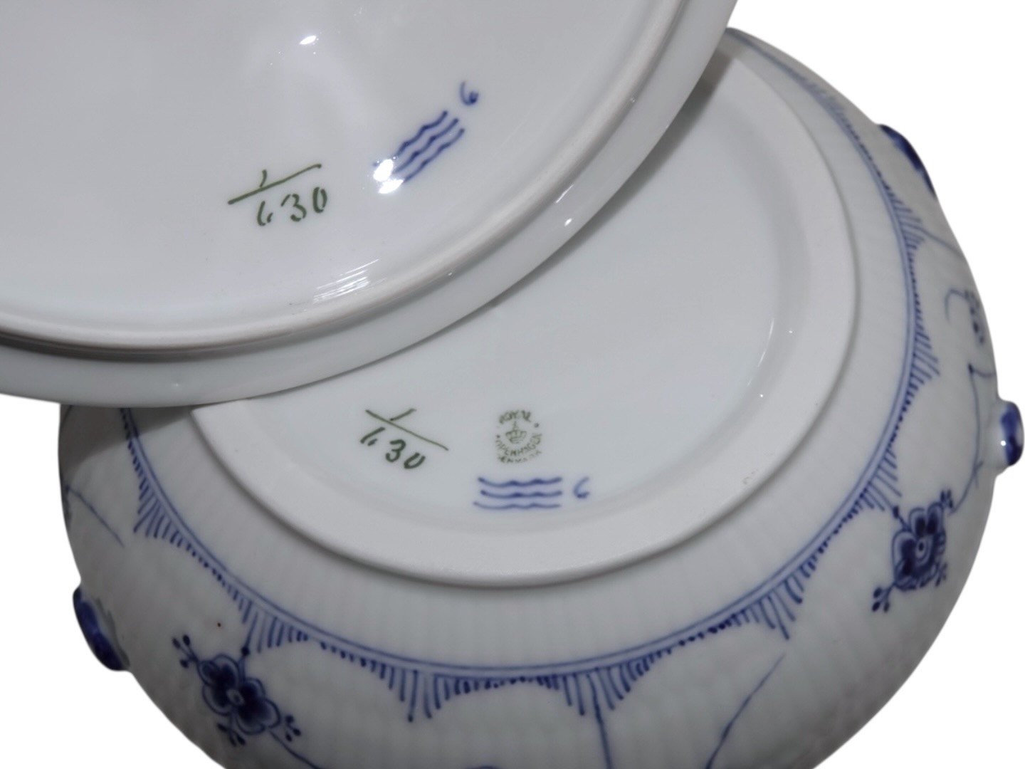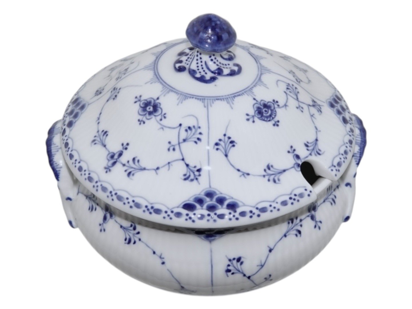 Beskrivelse: Kongelig Musselmalet Halvblonde, sjælden lille rund suppeterrin med låg.