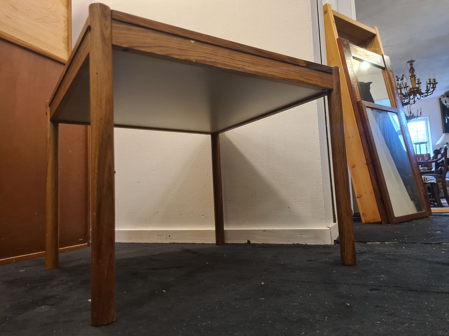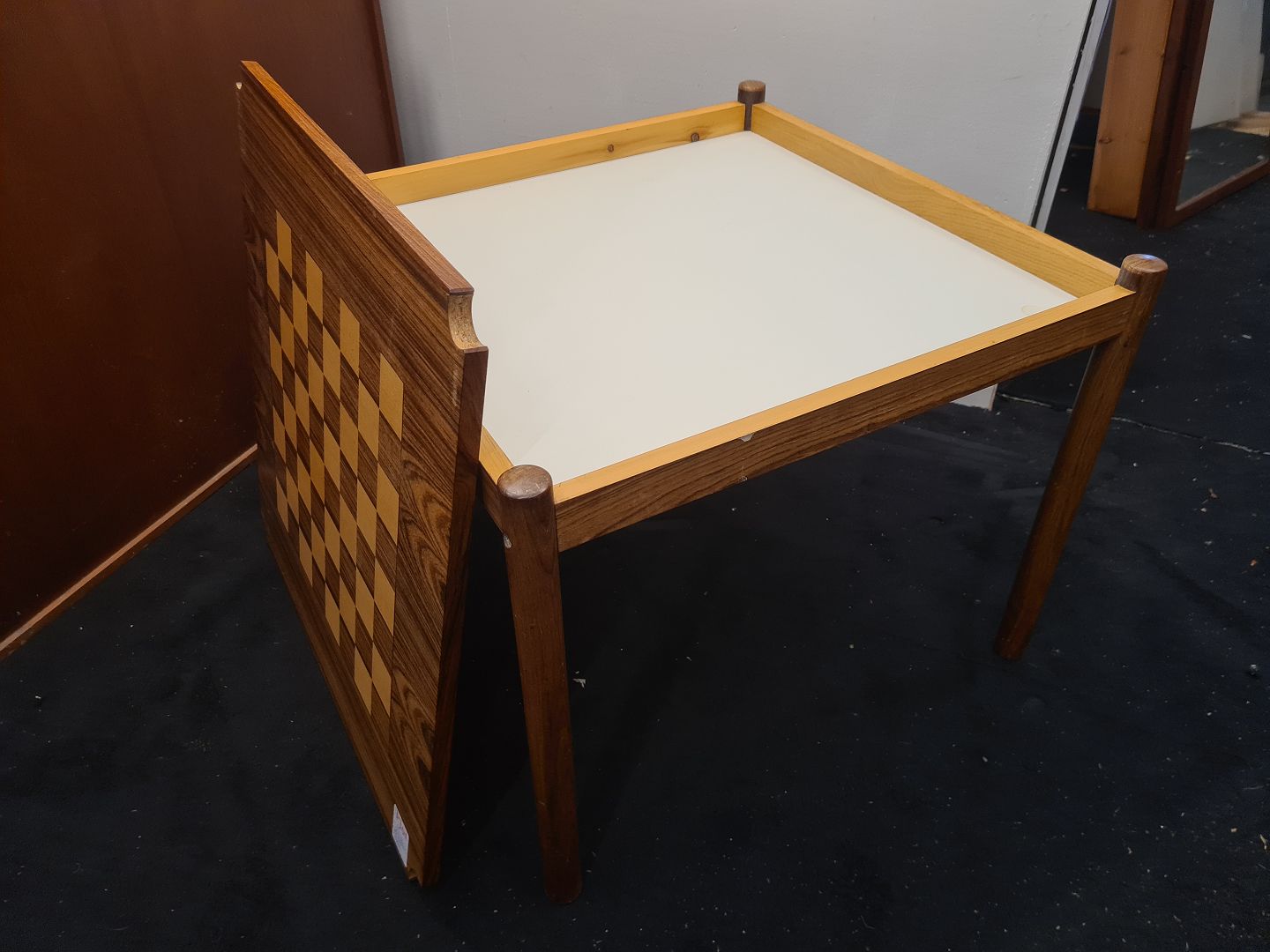Beskrivelse: Kvadratisk skakbord i palisander fremstillet hos Georg Petersens møbelfabrik i 1970'erne. Fremstår pænt, velholdt og udmærket funktionsdygtigt.