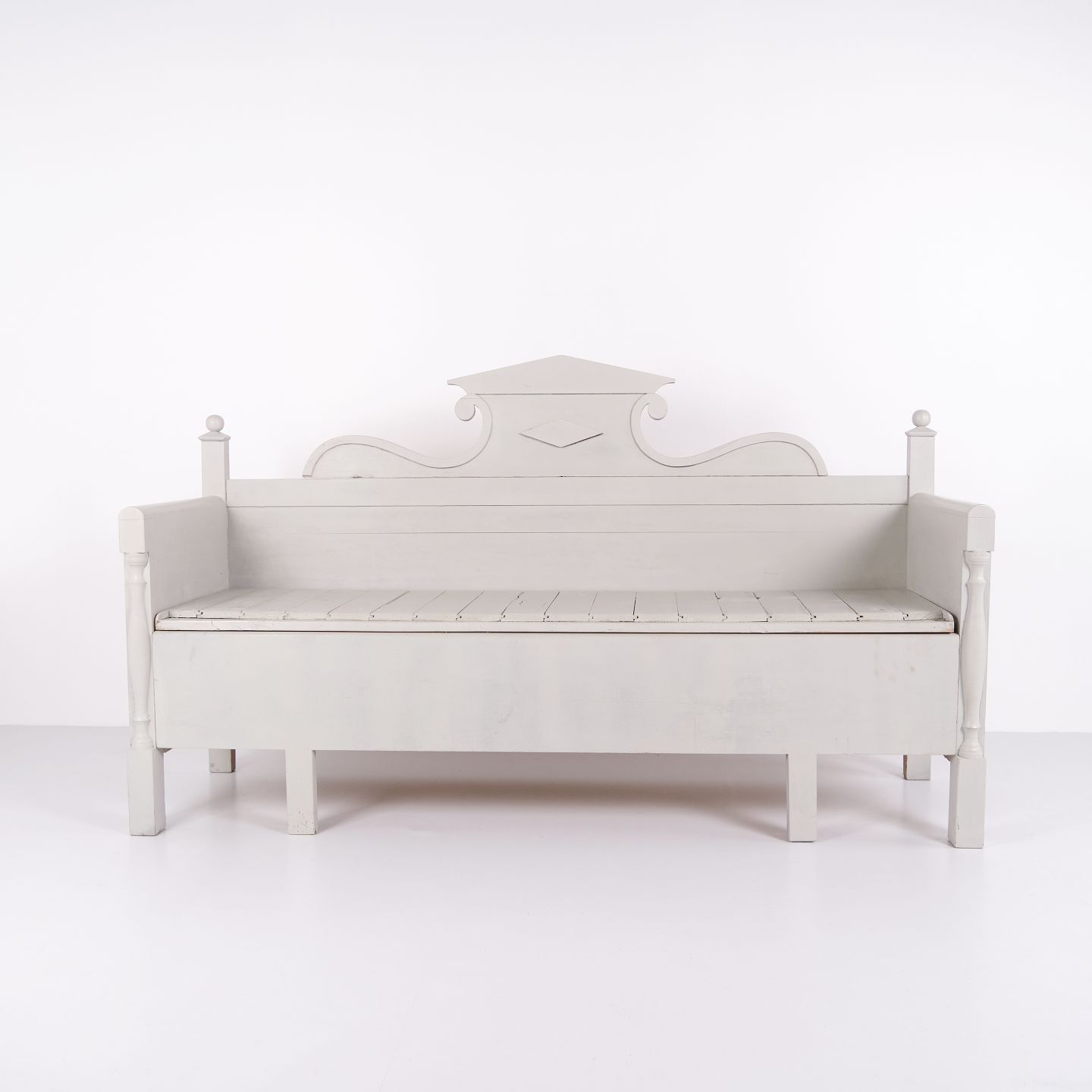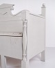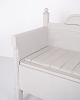 Beskrivelse: Antik slagbænk 1860’erne i gråmalet fyrretræ med udskårne detaljer og opbevaring. Antik opbevaringsbænk 1800-tallet.
