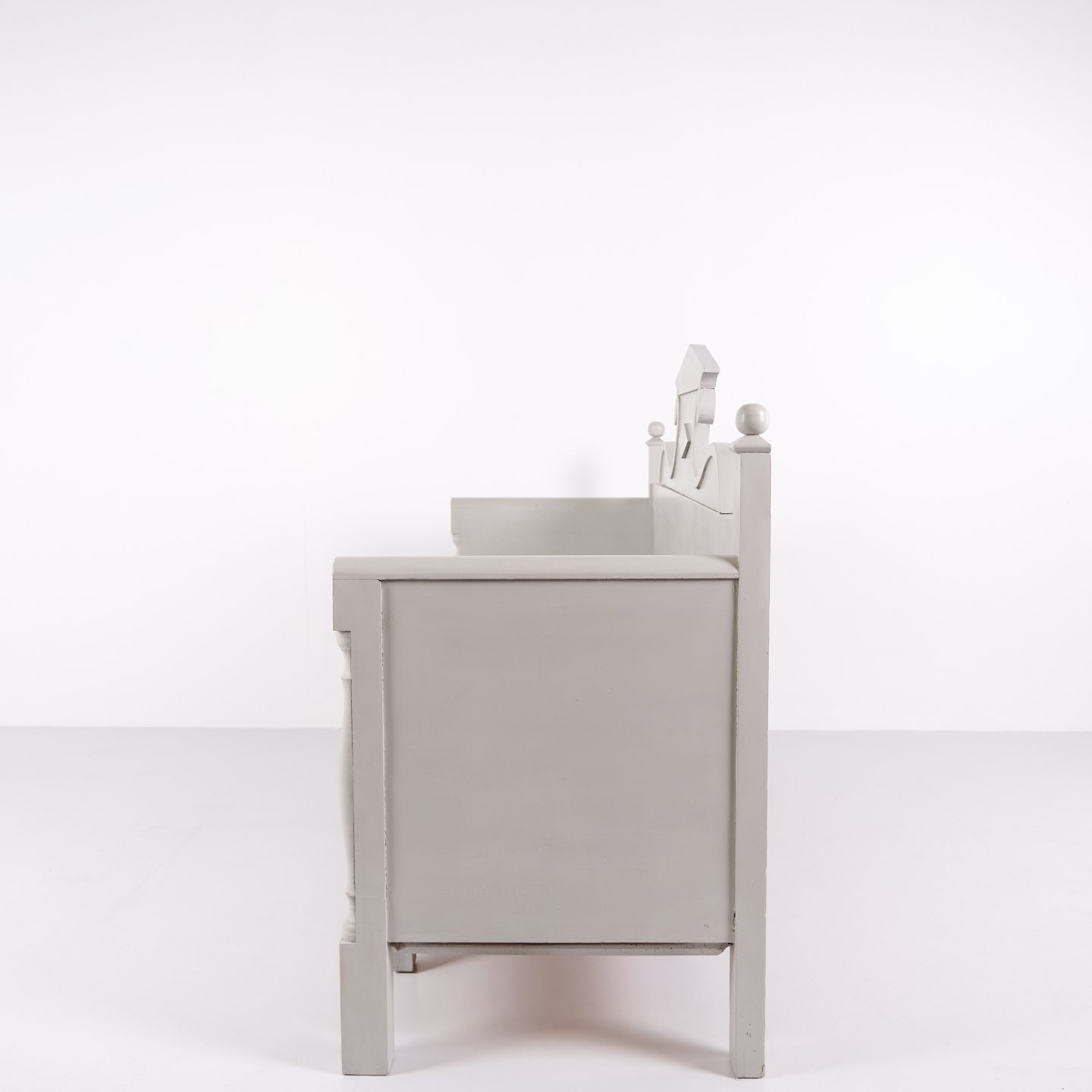 Antik Slagbænk Med Udskæringer - Gråmalet - Fyrretræ - Opbevaring - År 1860erne
