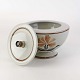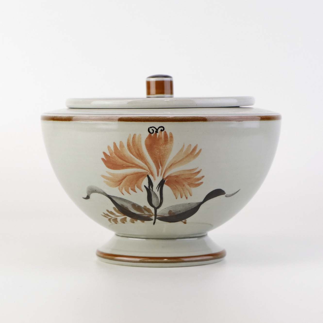 Beskrivelse: Lågskål til sukker i fajance fra stellet Kirsten, som blev fremstillet i perioden 1934-1957. Nr. 263