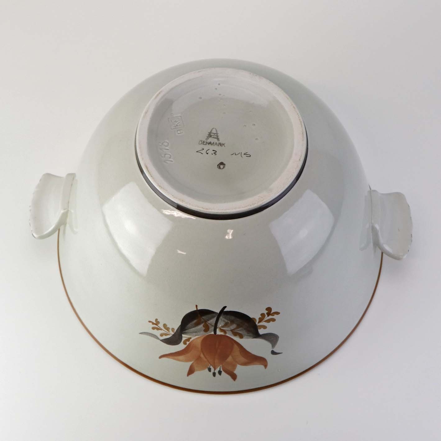 Beskrivelse: Stor suppeterrin i fajance fra stellet Kirsten, som blev fremstillet i perioden 1934-1957. Nr. 263/1518