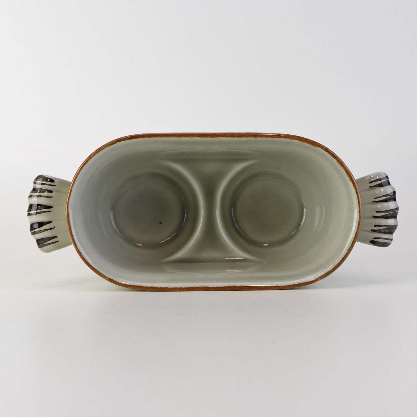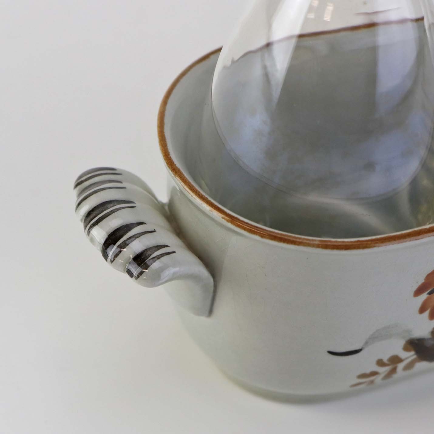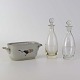 Beskrivelse: Sæt med to glasflasker til olie og eddike med prop i kar med hanke af fajance fra stellet Kirsten, som blev fremstillet i perioden 1934-1957.