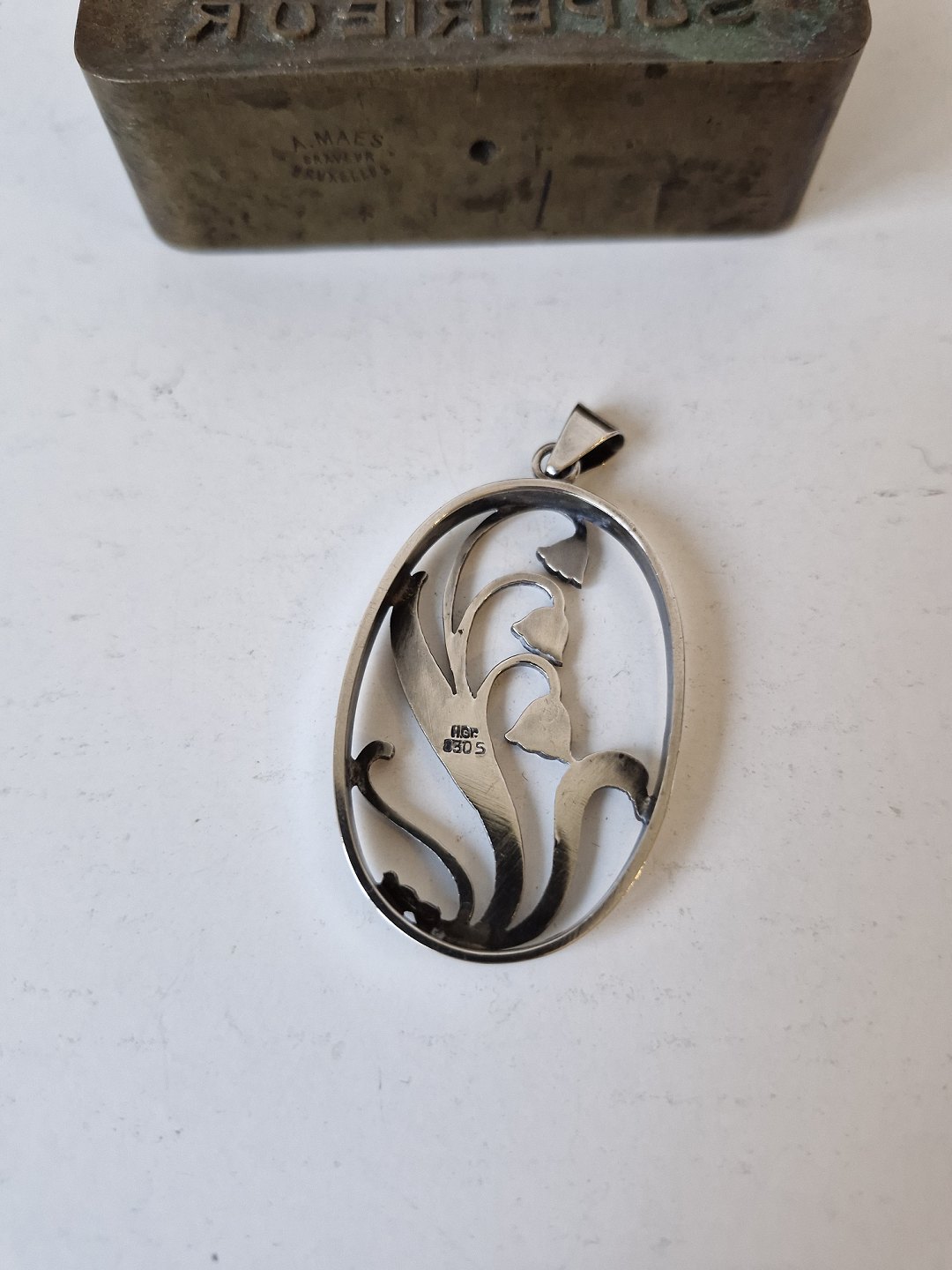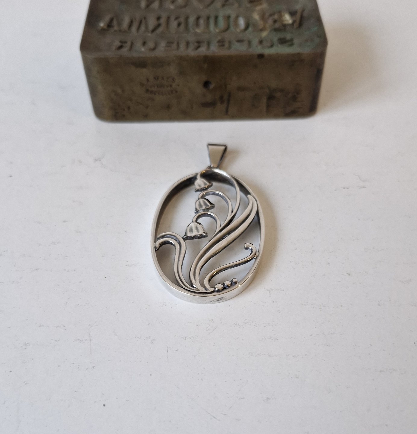 Beskrivelse: Hugo Grün sølv vedhæng dekoreret med liljekonval
