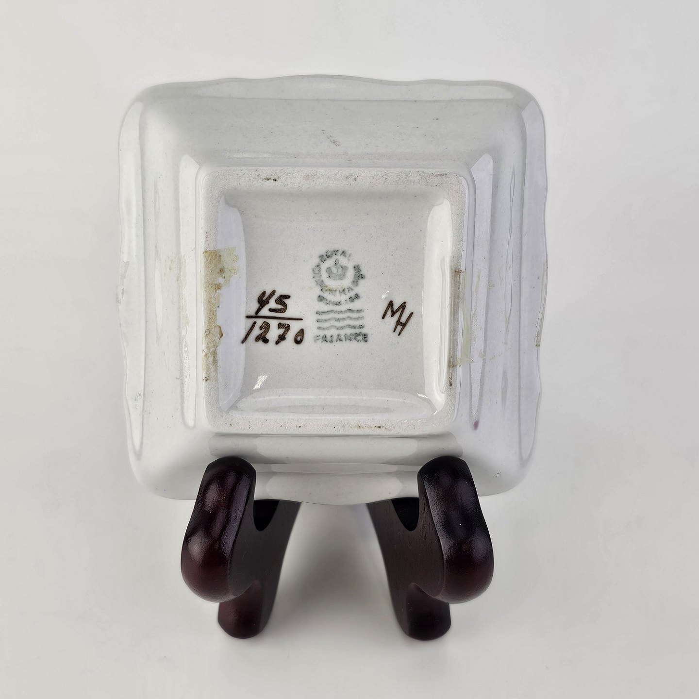 Beskrivelse: Firkantet asiet i fajance fra stellet Brun Tranquebar fra år 1919