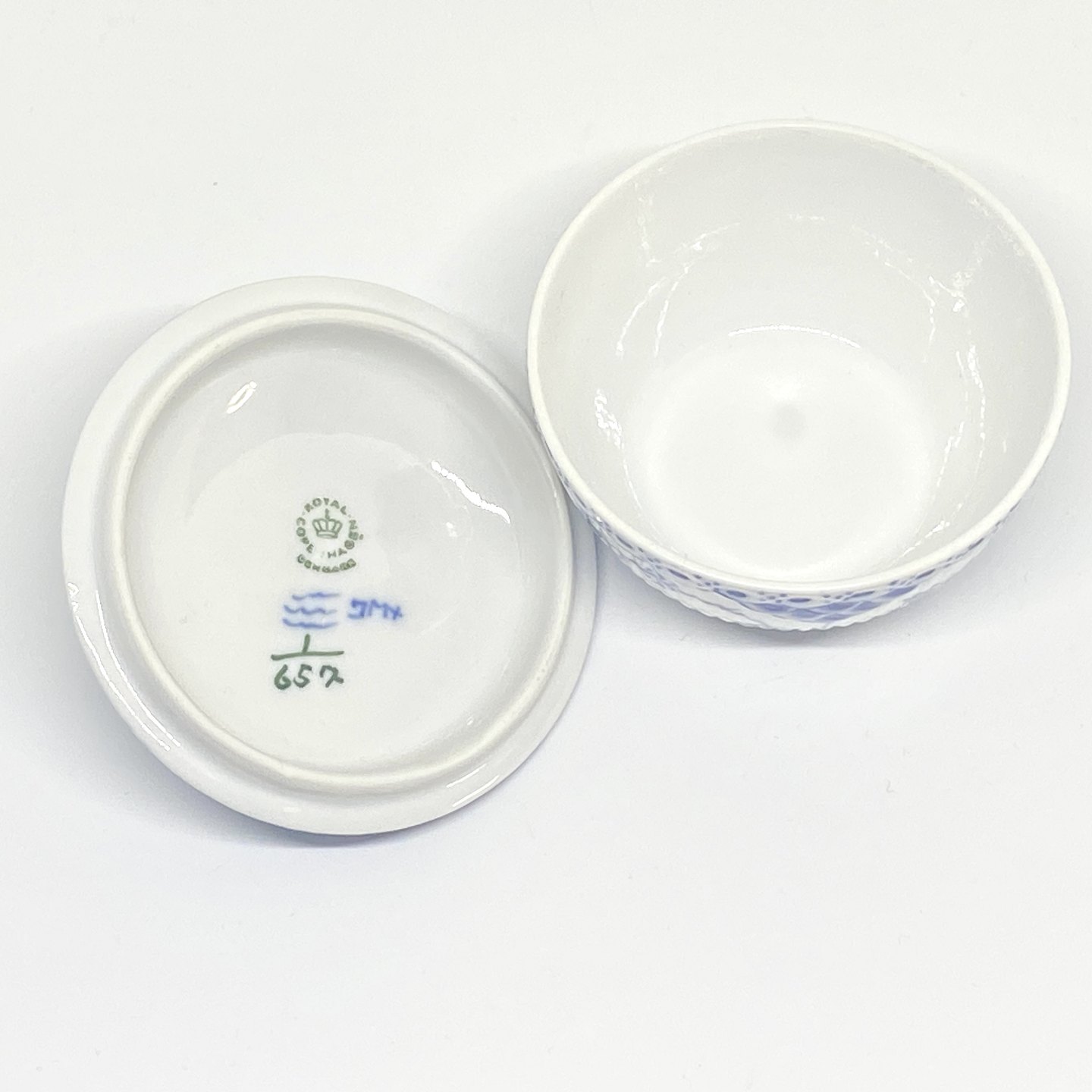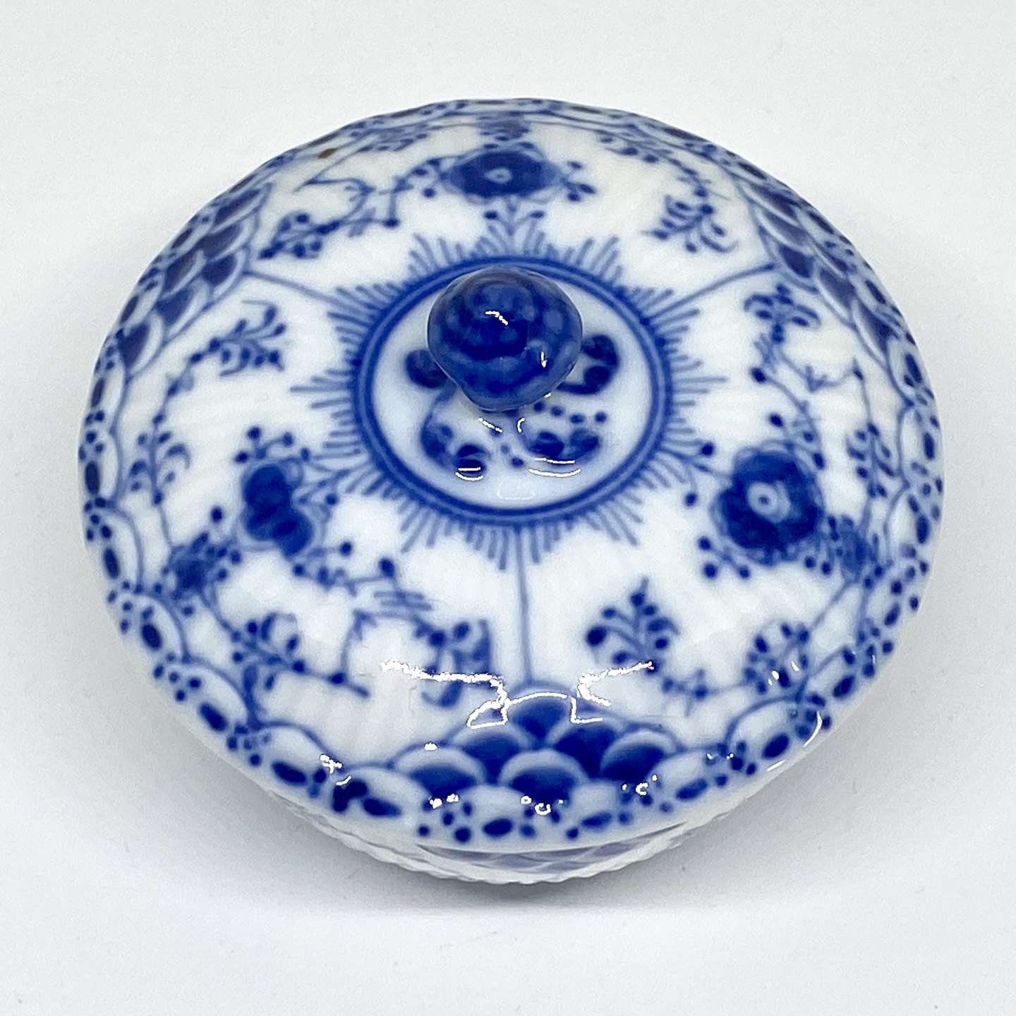 Description: Royal Copenhagen/Kgl. Blue Fluted half lace. Small sugar bowl with lid. Decoration number 1/657. Bowl 2nd grade, lid 3rd grade. Dimensions: Ø 8.5 cm. H. 8 cm.