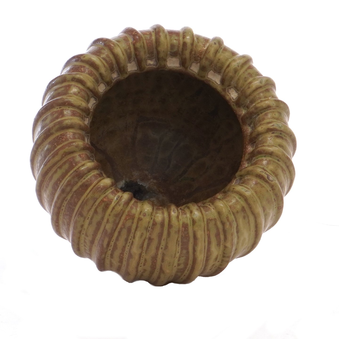 Beskrivelse: Arne Bang bredriflet vase med brungrøn glasur og hvælvet kant