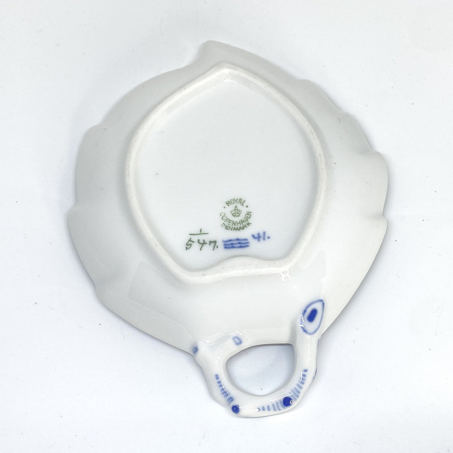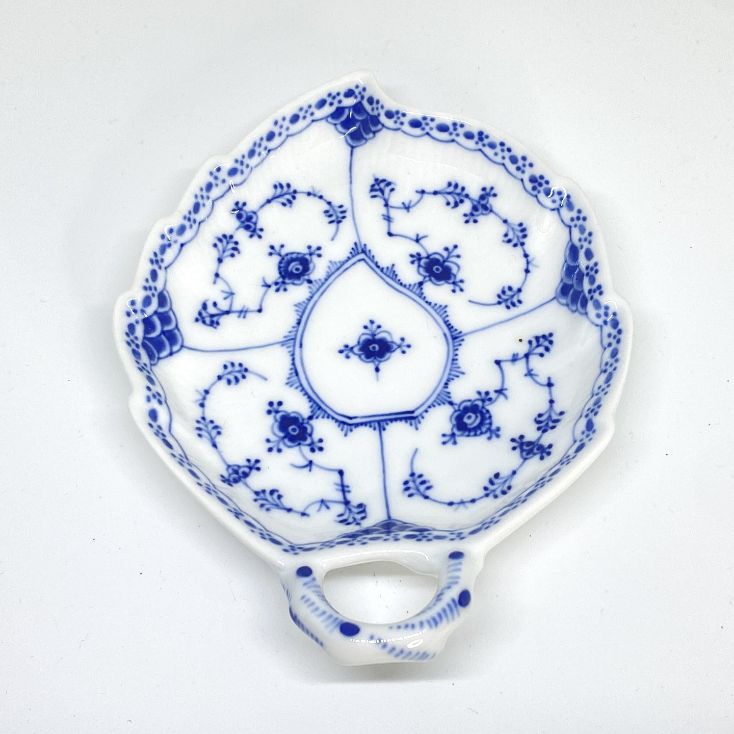 Description: Royal Copenhagen/Kgl Blue Fluted half-lace leaf-shaped plate with fixed handle. Decoration number 1/547. 2nd grade. Dimensions: 18.5 x 14.5 cm.