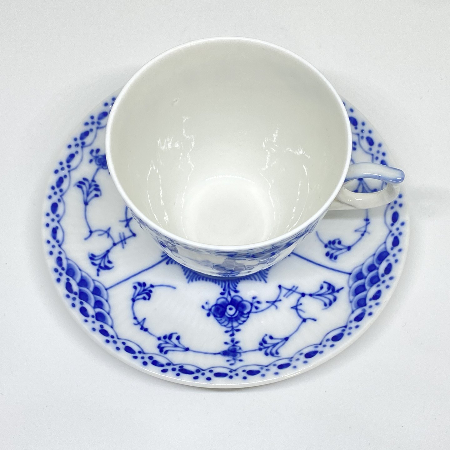 Beskrivelse: Royal Copenhagen/Kgl Musselmalet halvblonde kaffekop og underkop.