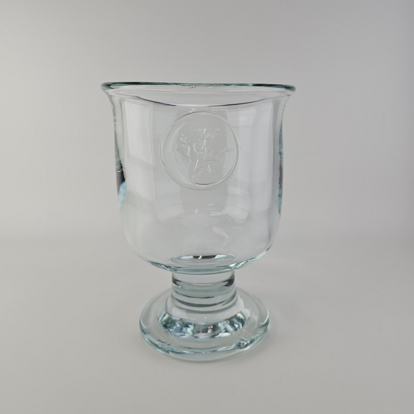 Beskrivelse: Pokal i glas produceret i forbindelse med Privatbankens 125 års jubilæum. Pokalen er prydet med et segl på, der forestiller en Hermesfigur og har kalkform