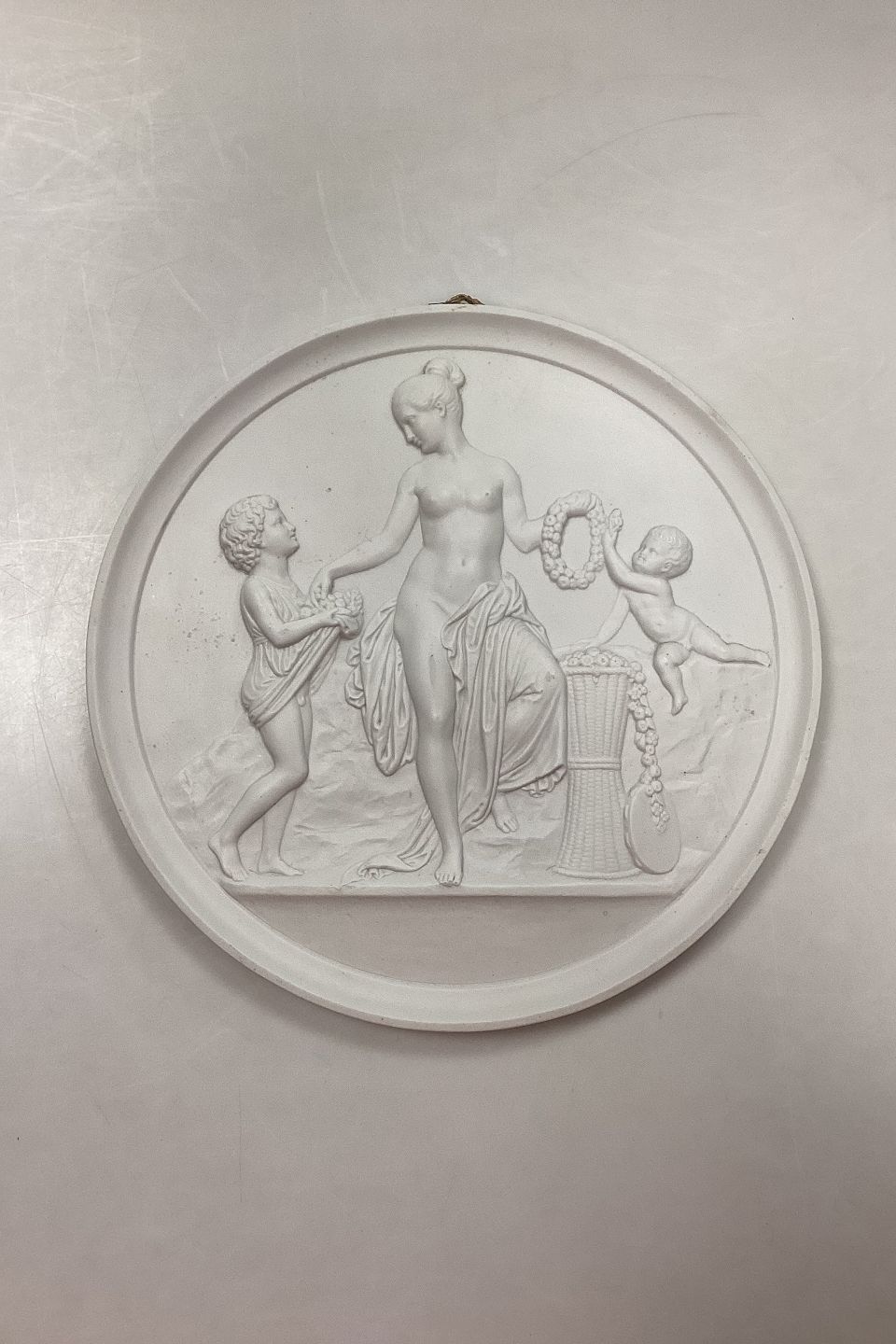 Beskrivelse: Bing og Grondahl Biscuit Platte - Barndom og Forår No. 116. Kopi efter Thorvaldsens original fra Rom 1836.