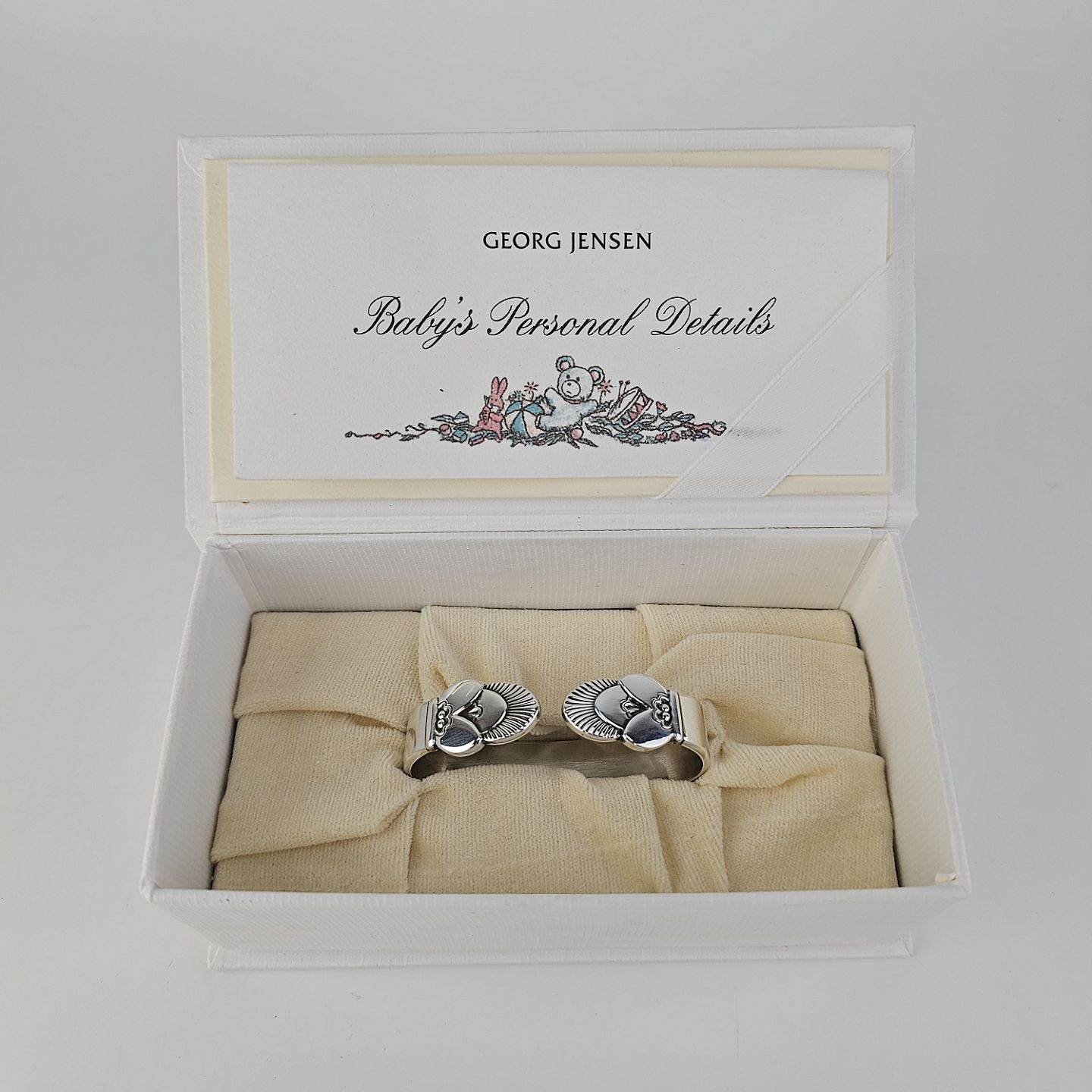 Beskrivelse: Servietring med Kaktus mønster i sterling sølv med tilhørende æske og kort, Baby's Personal Details
