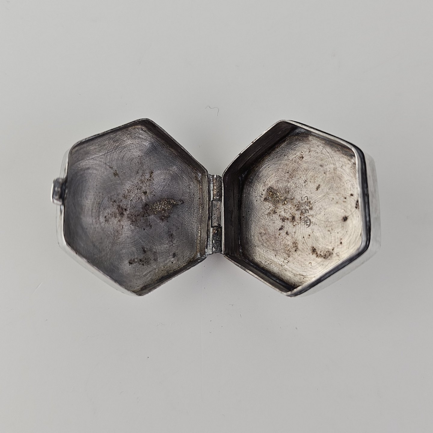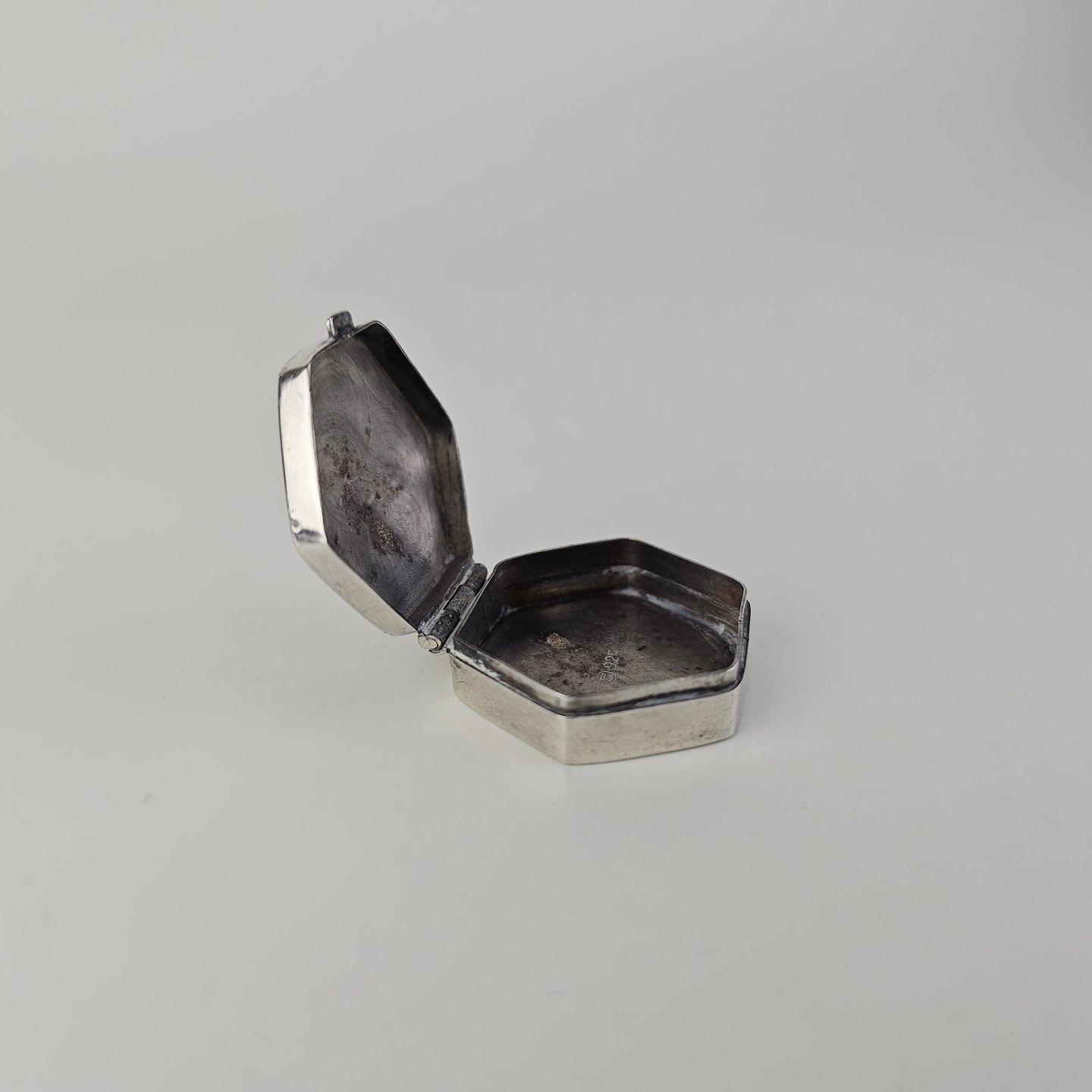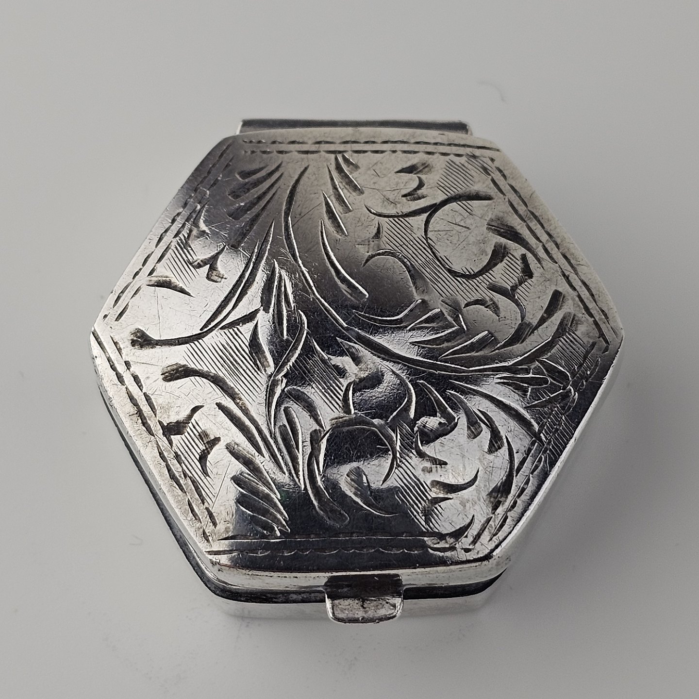 Beskrivelse: Sekskantet pilleæske i sterling sølv med indgraveret bladmotiv