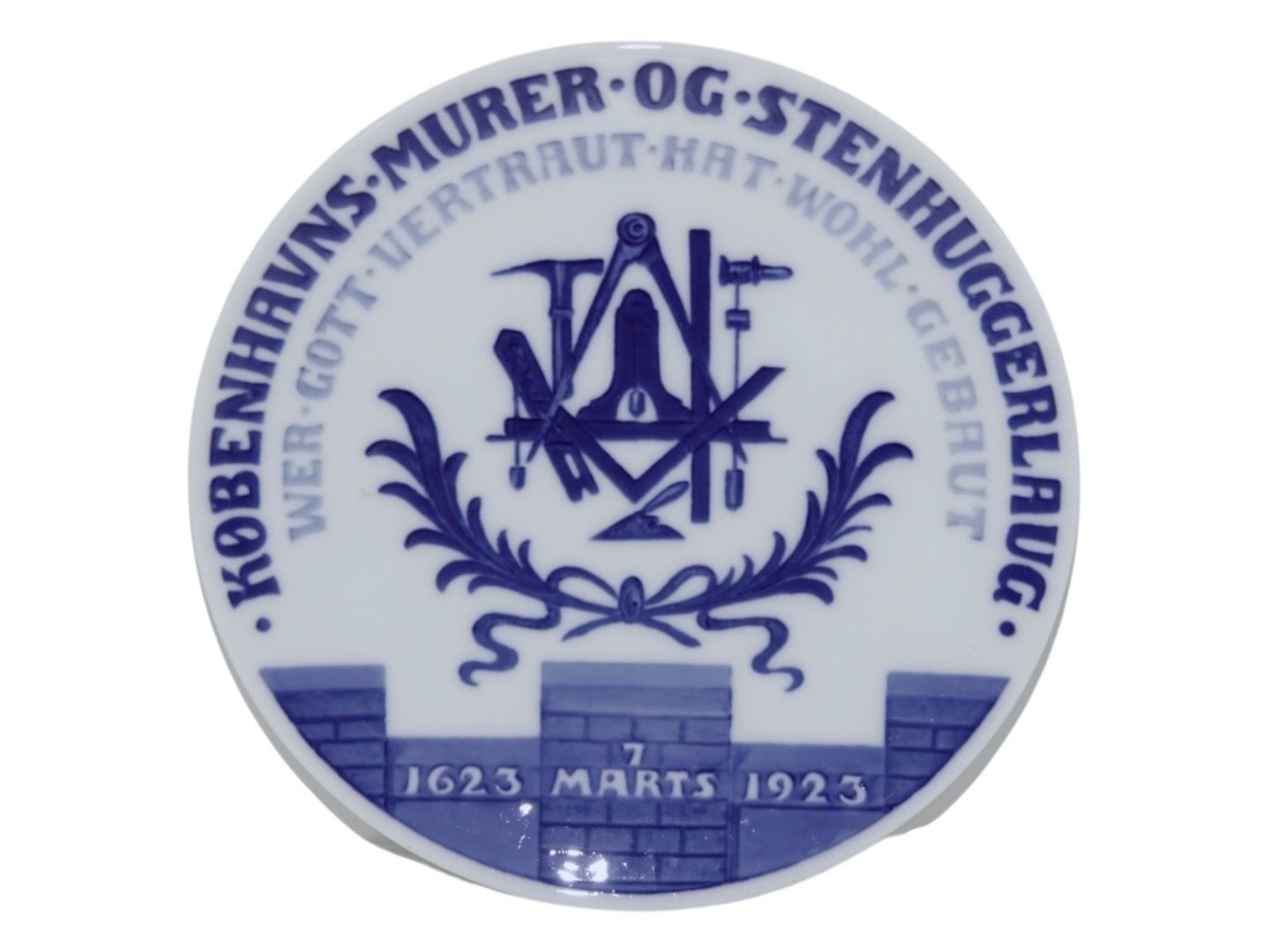 Beskrivelse: Royal Copenhagen Mindeplatte fra 1923, Københavns Murer og Stenhuggerlaug - 7. Marts 1623-1923.