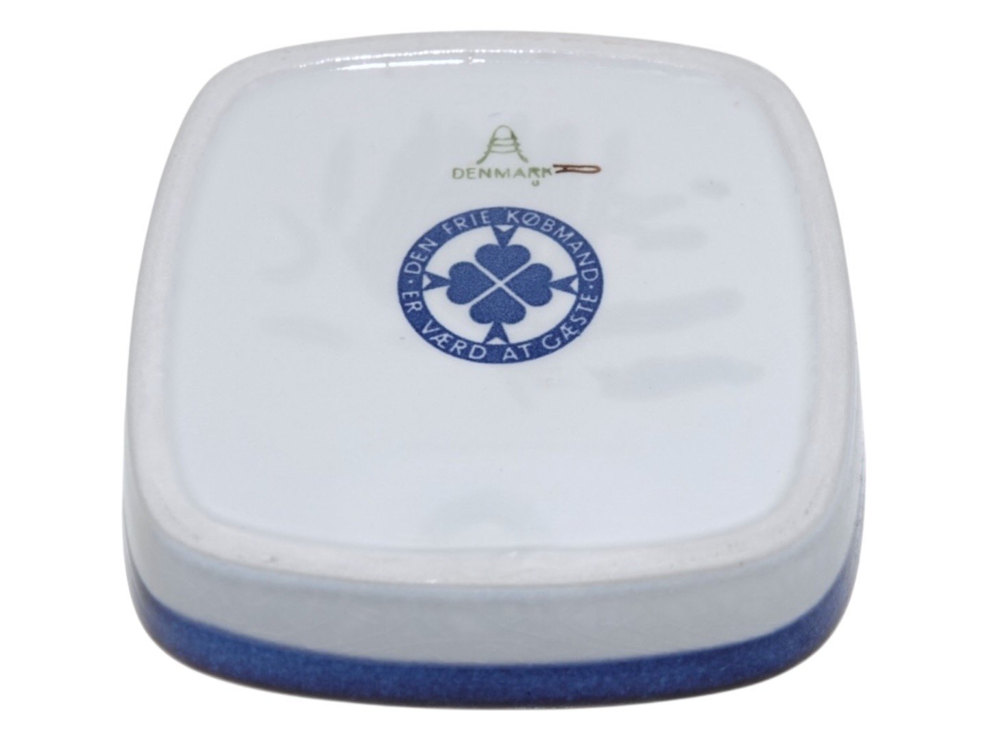 Beskrivelse: Royal Copenhagen Baca, lille blå firkantet skål med teksten bagpå: Den Frie Købmand er værd at gæste.
