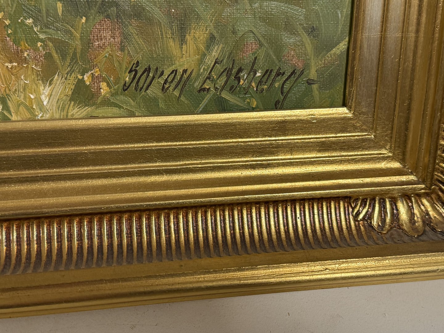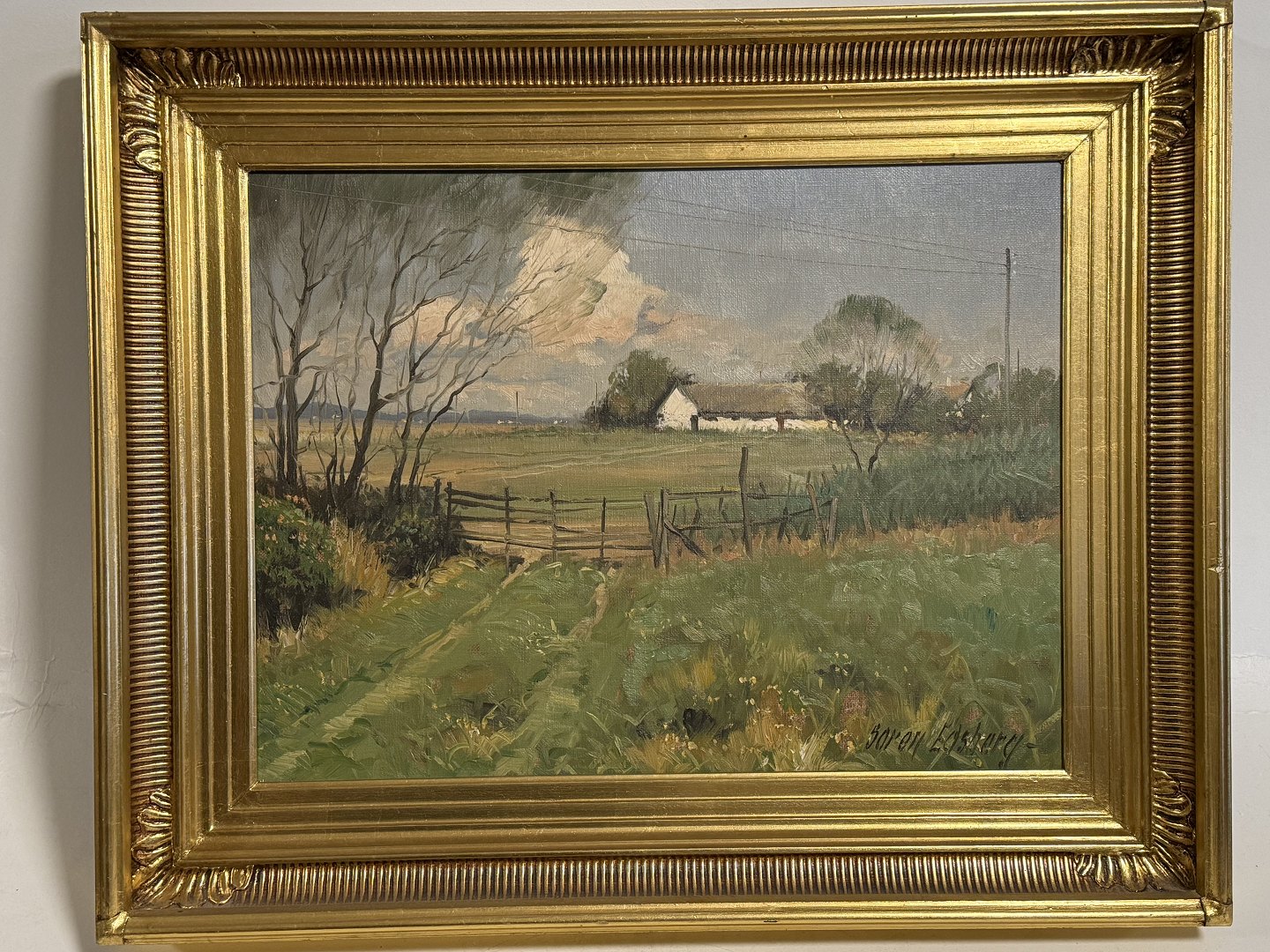 Beskrivelse: Søren Edsberg (f. 1945 ), Oliemaleri på lærred med motiv fra landet, Mål med ramme: 53x43cm, lille fejl på rammen ellers pæn stand