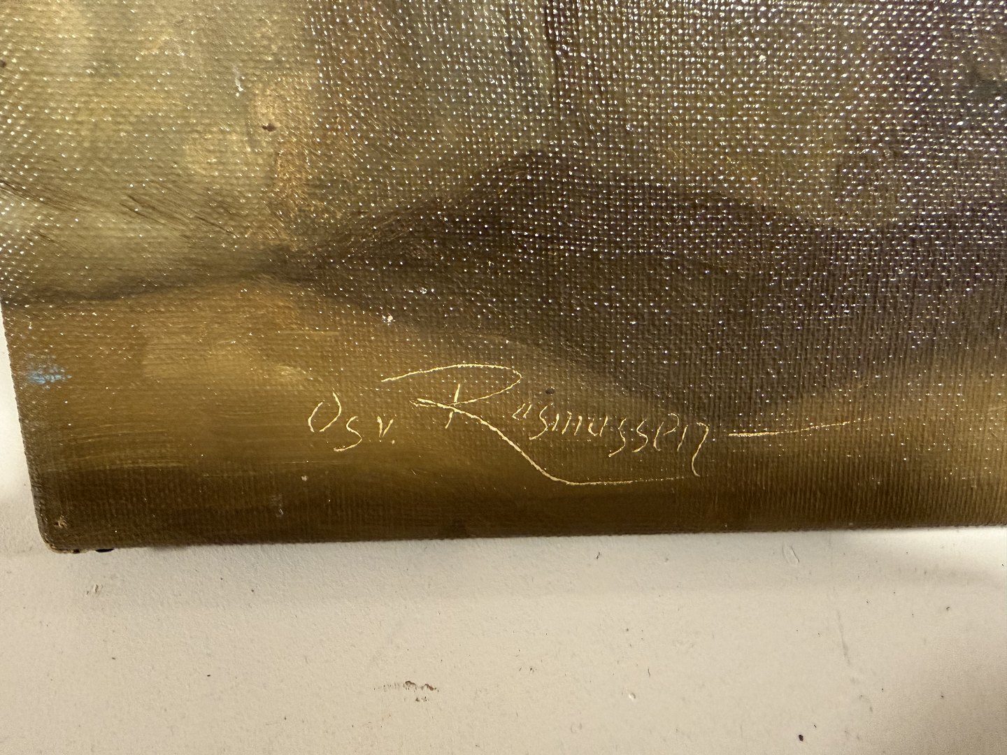 Beskrivelse: Osvald Rasmussen (1885-1972), Uindrammet maleri på lærred af interiører med ildsted / køkken fra 1747, signeret Osv Rasmussen, Mål 49x39cm.