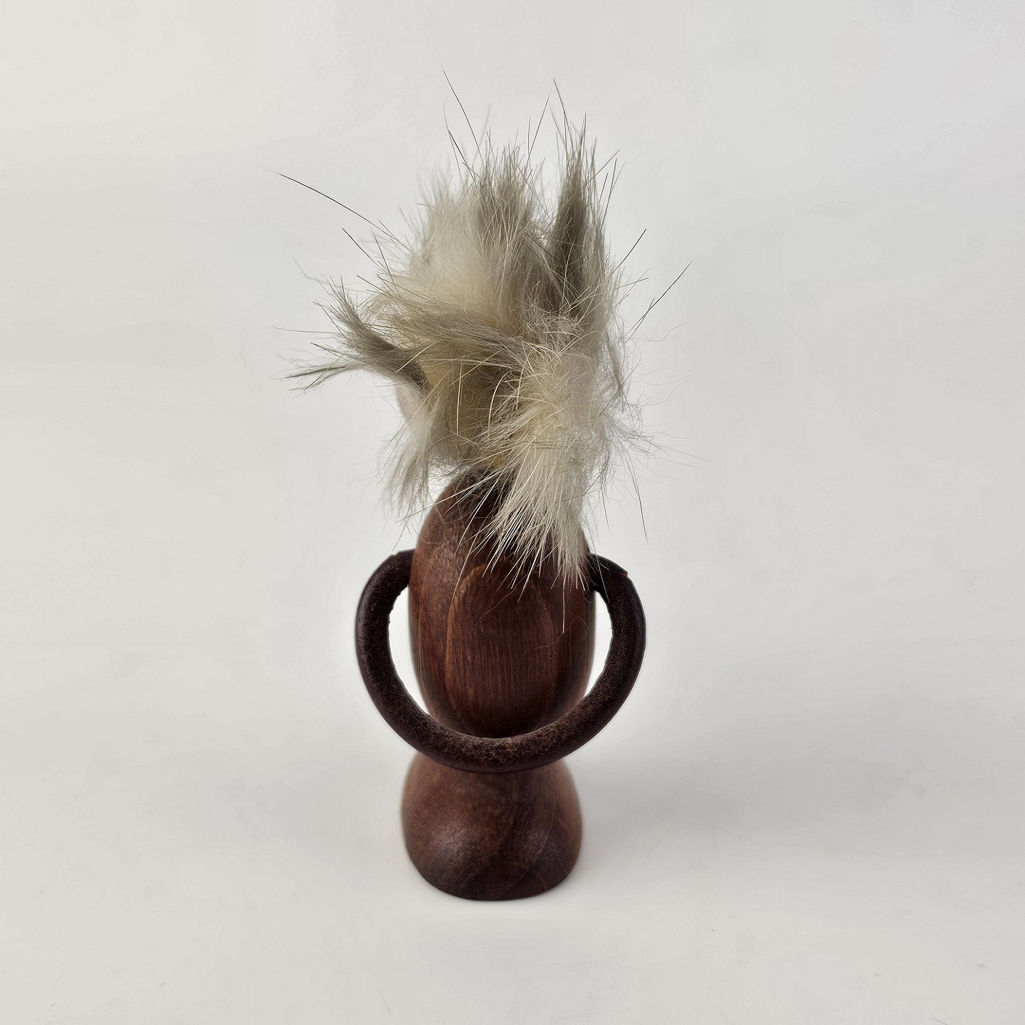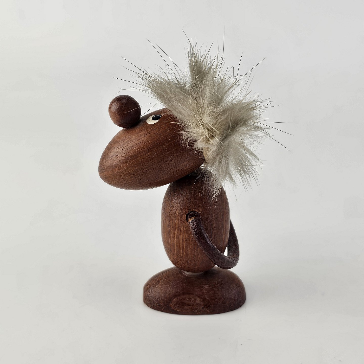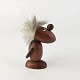 Beskrivelse: Håndskåret figur af teak med gråt hår og arme af læder. Fra 1960'erne