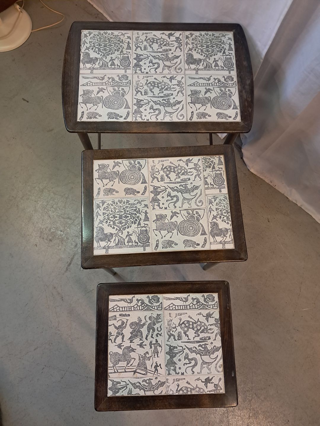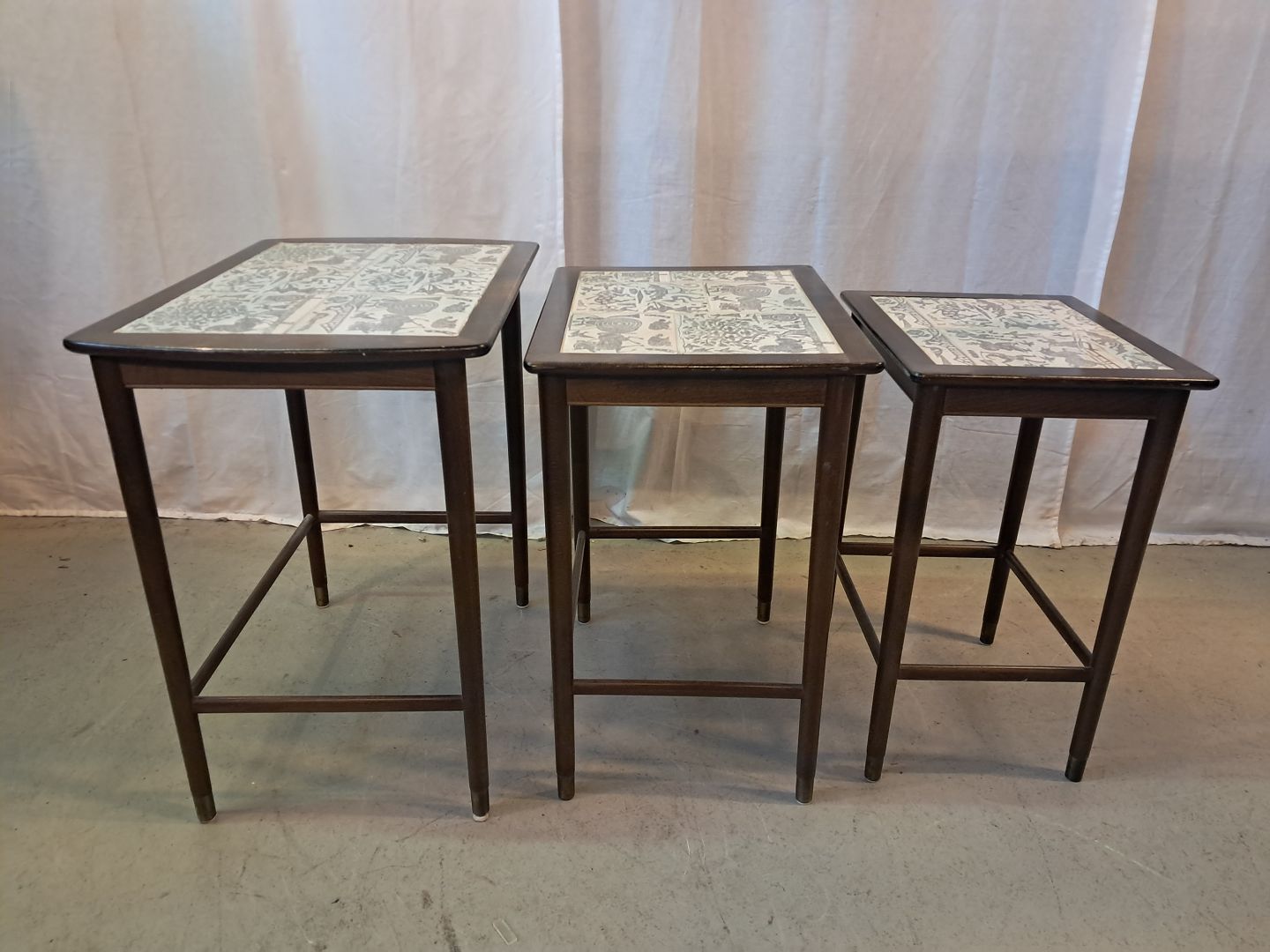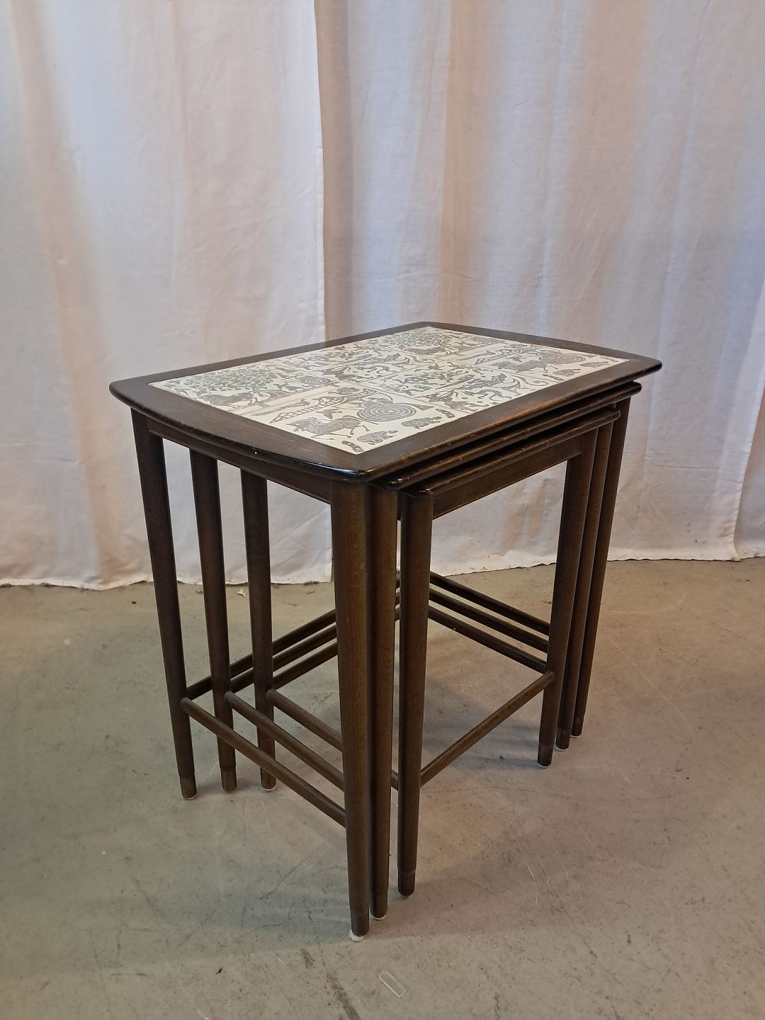 : 3 Indskudsborde i nødetræ med kakler, fra 1950erne.