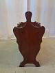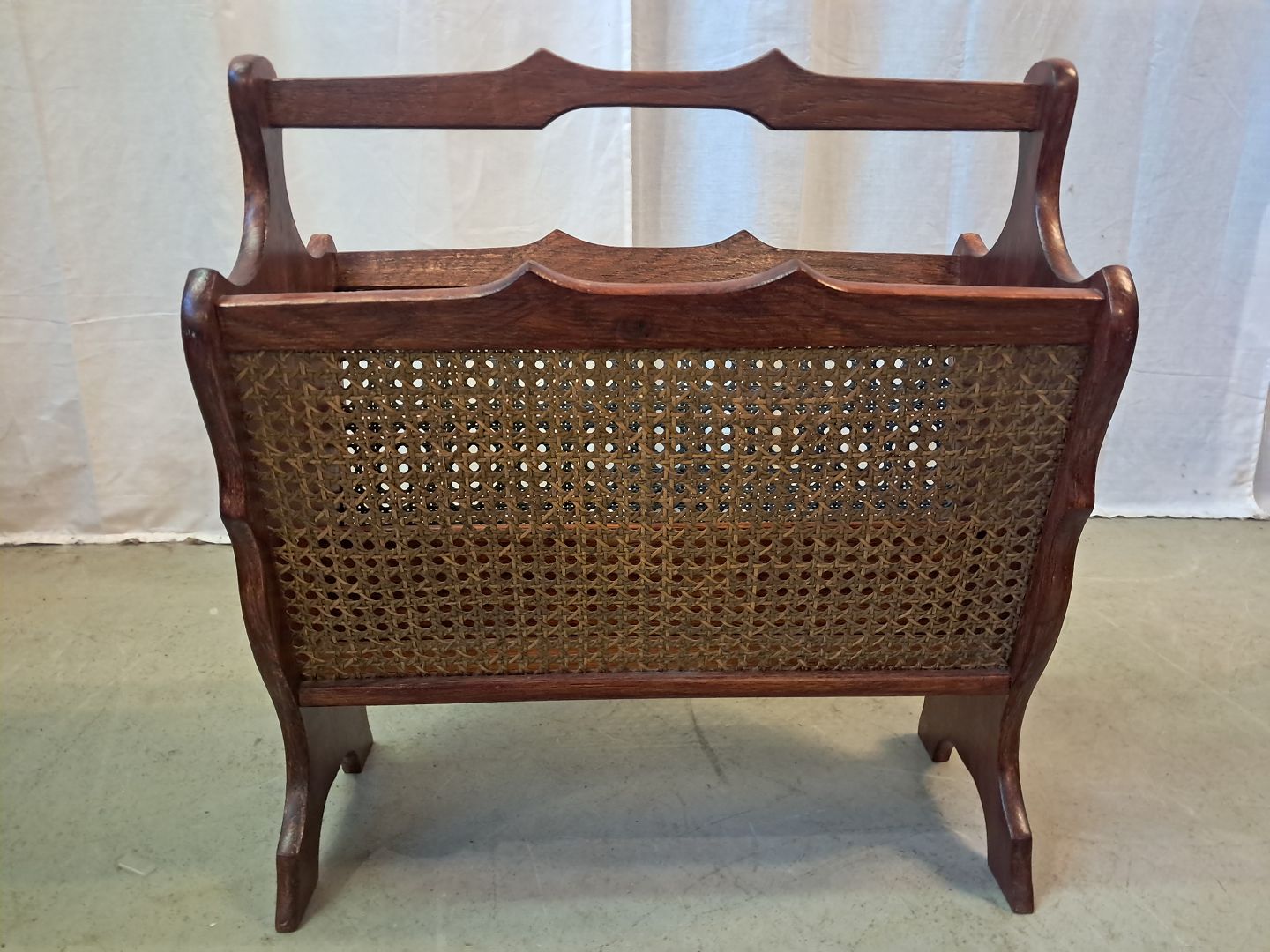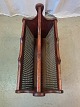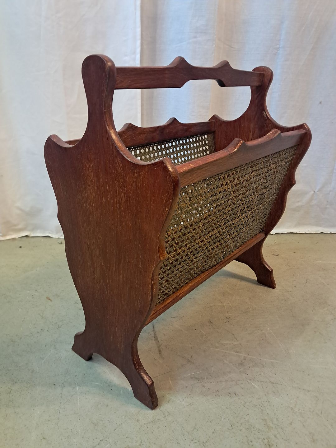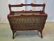 Beskrivelse: Avisholder i bejdset massivt egetræ med rørflet, fra 1990erne.