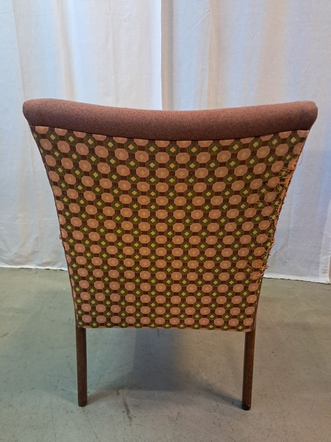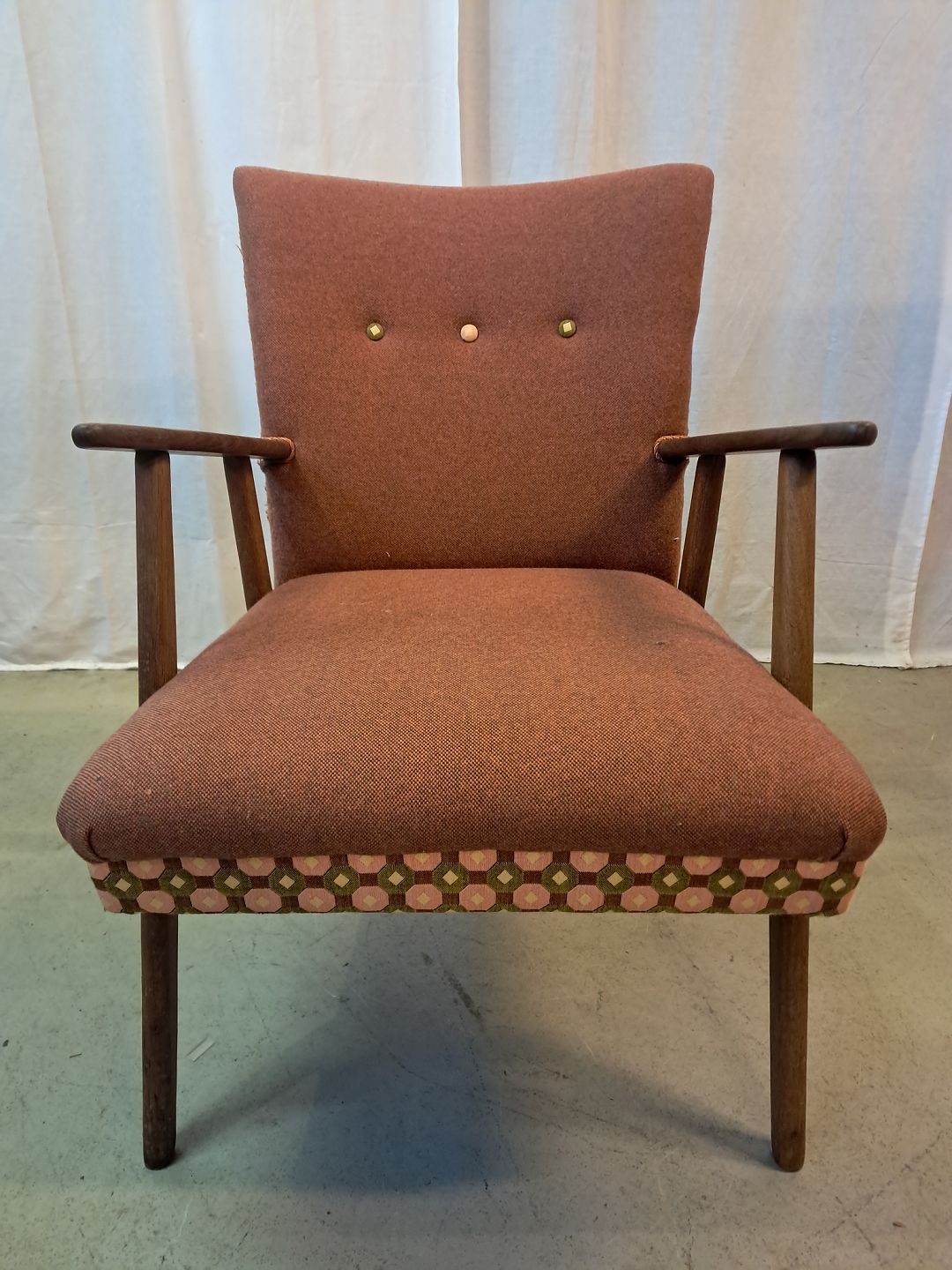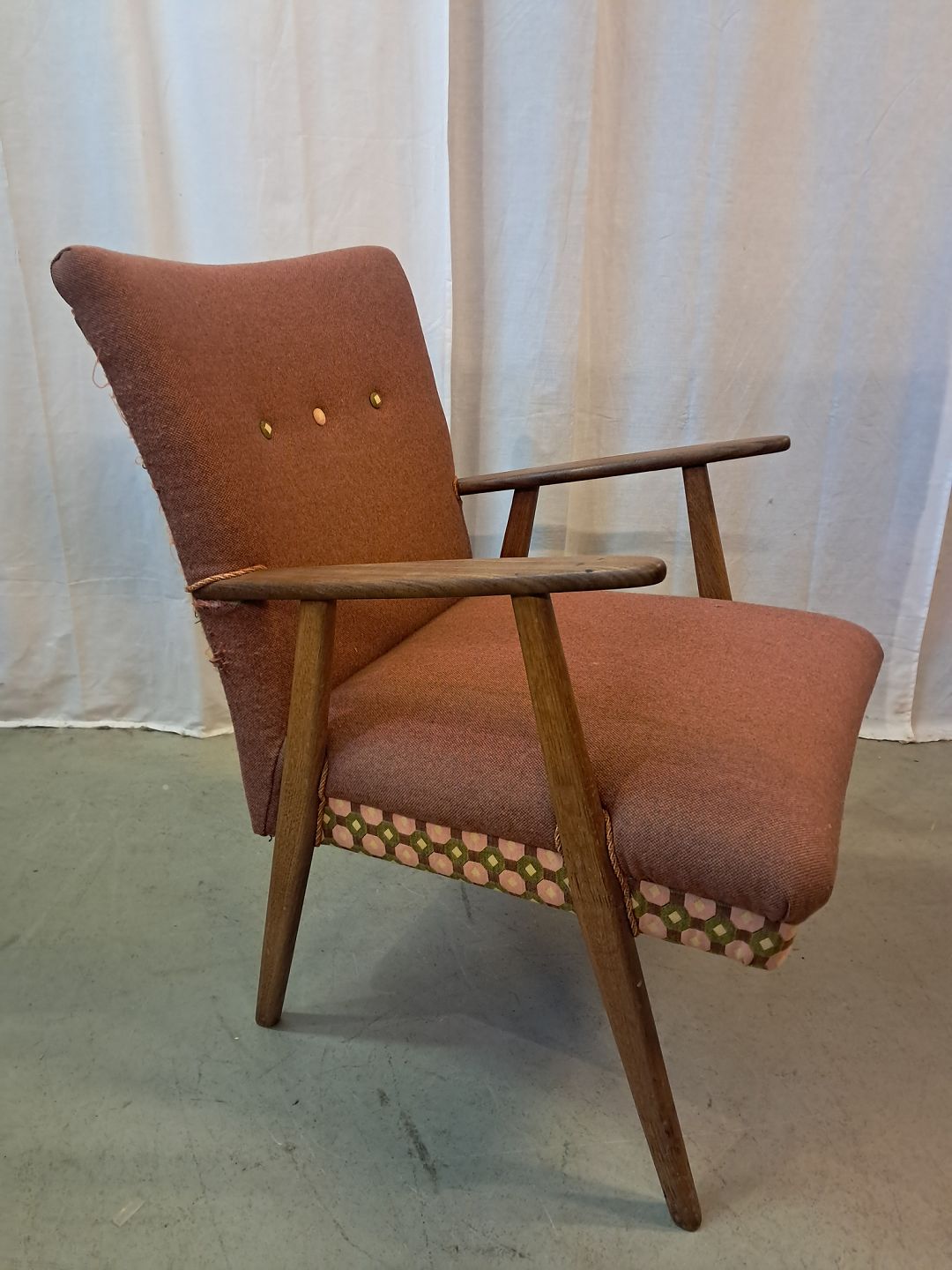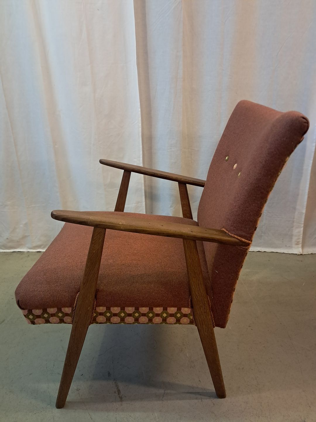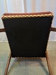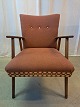 Beskrivelse: Lænestol i teaktræ med stofbetræk, fra 1960erne.