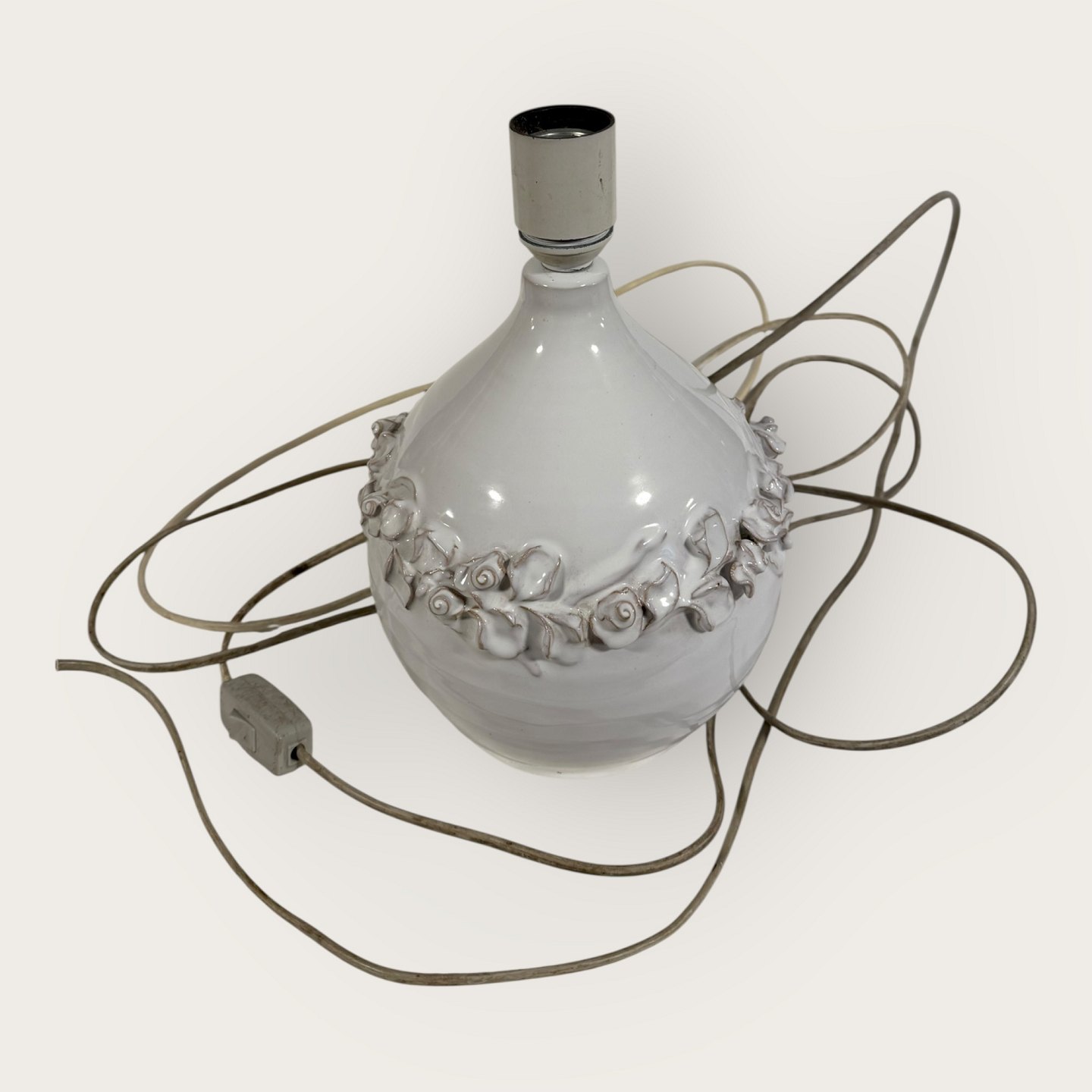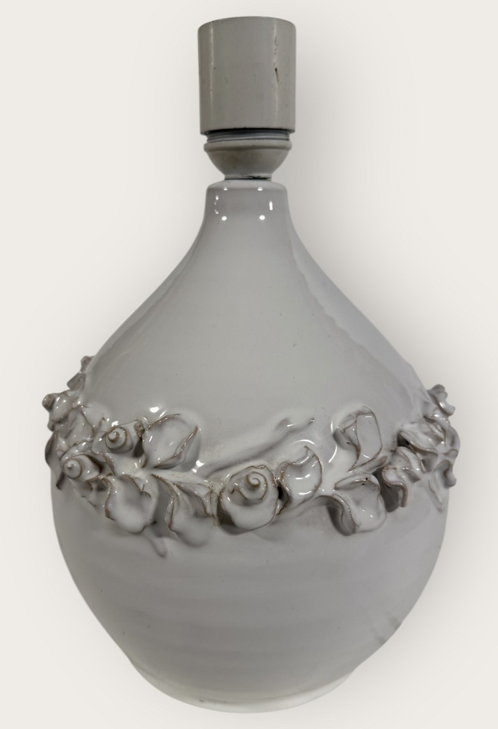 Beskrivelse: Torben Keramik, Stor hvid bordlampe med blomsterranke, højde med fatning 27,5cm, signeret Torben Danmark 175 *Fin stand*