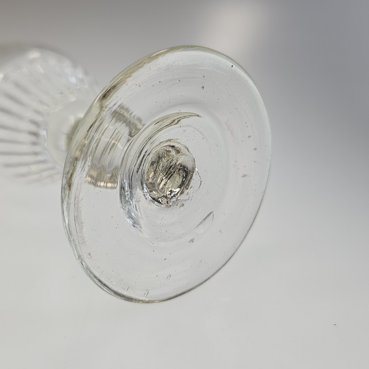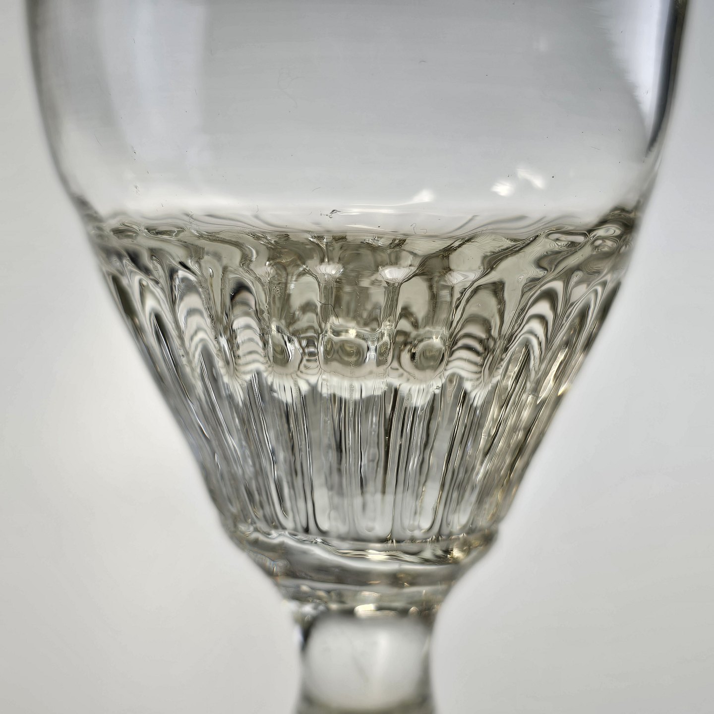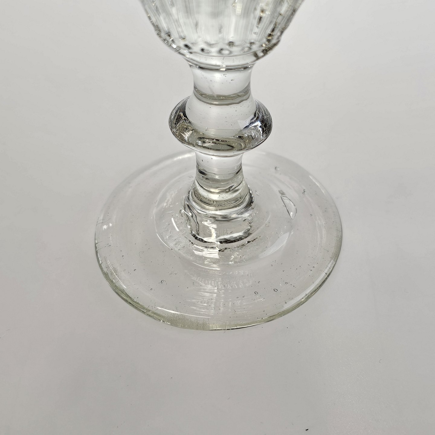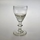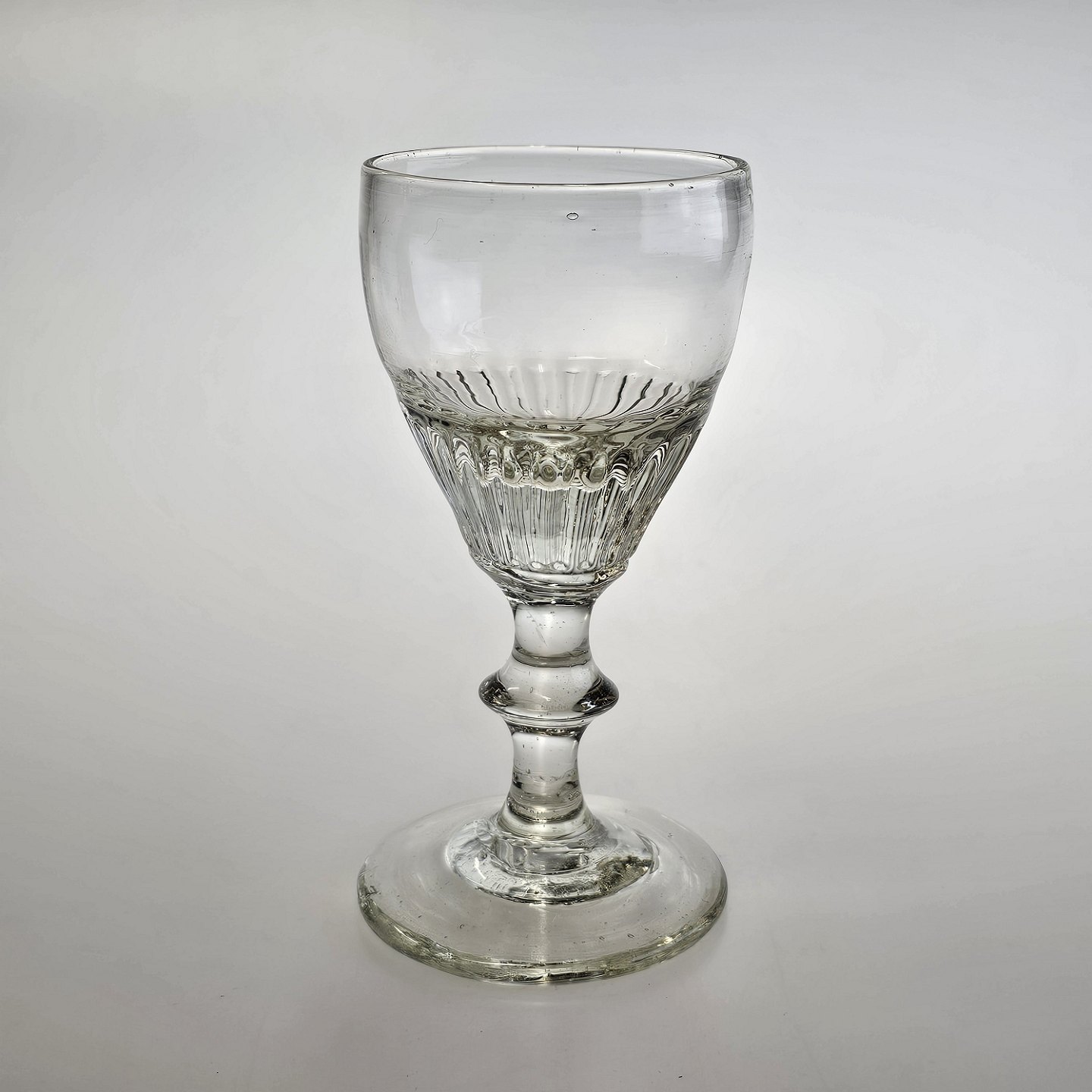 Beskrivelse: Håndblæst vinglas med riflet, tøndeformet kumme på stilk med knap