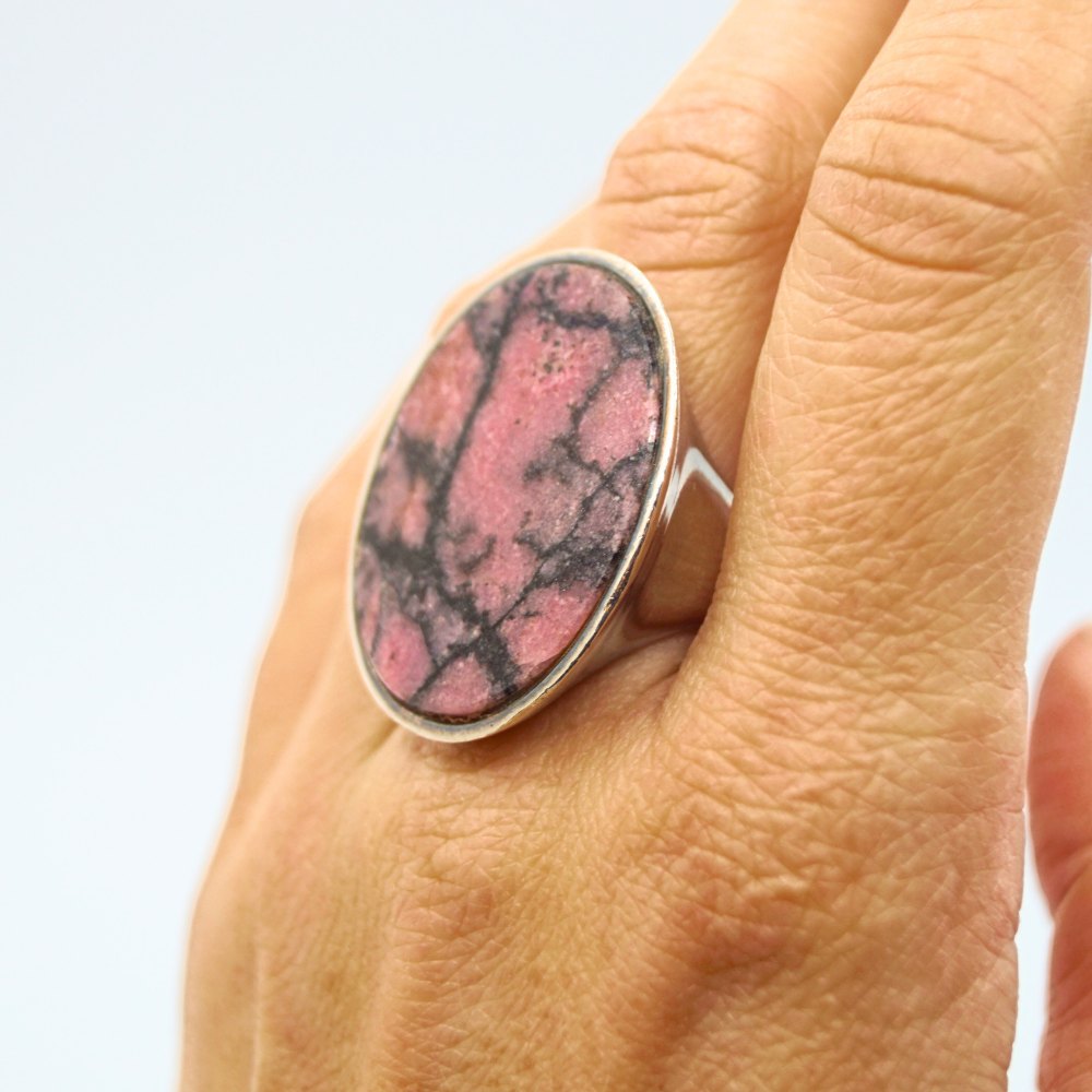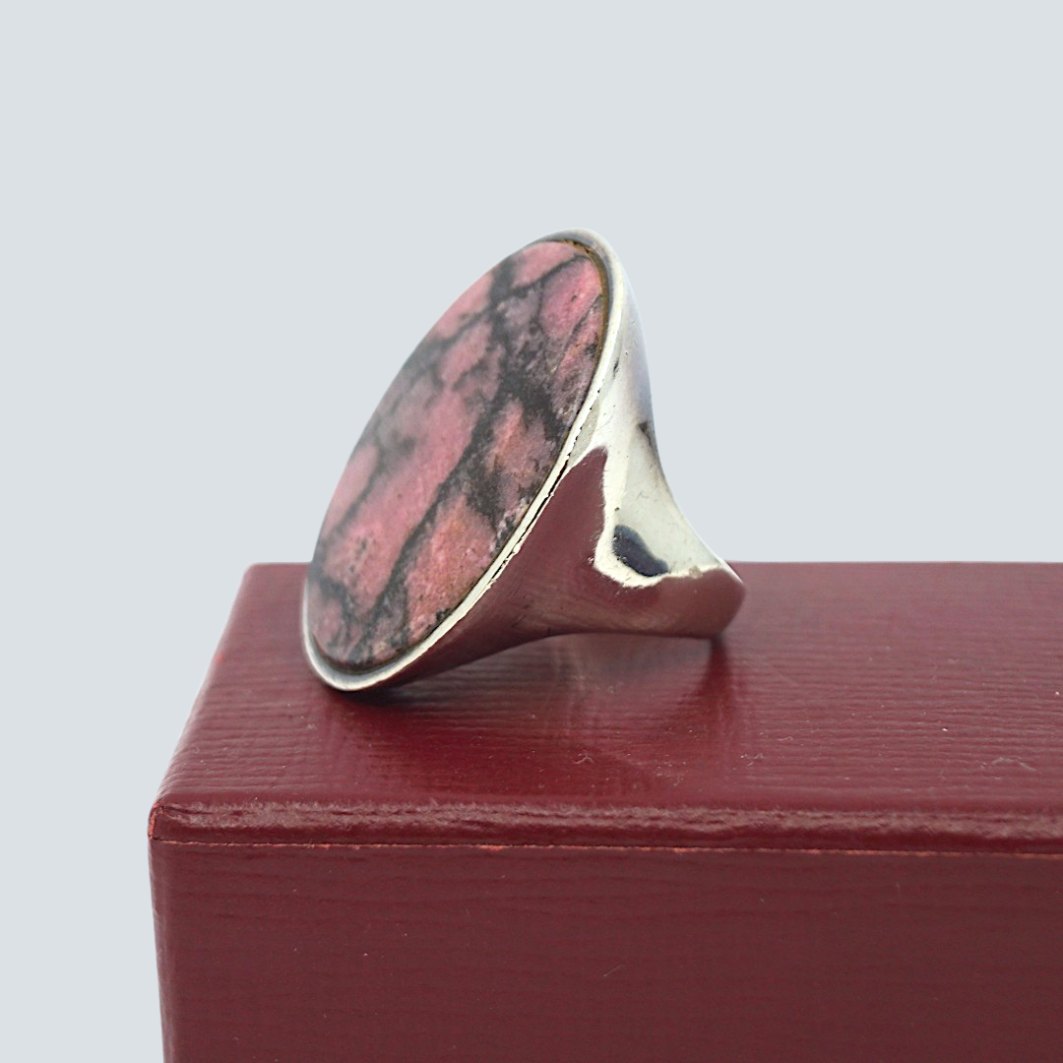 Beskrivelse: Hugo Grün; Sølvring prydet med stor oval tugtupit. Ring str. 53.