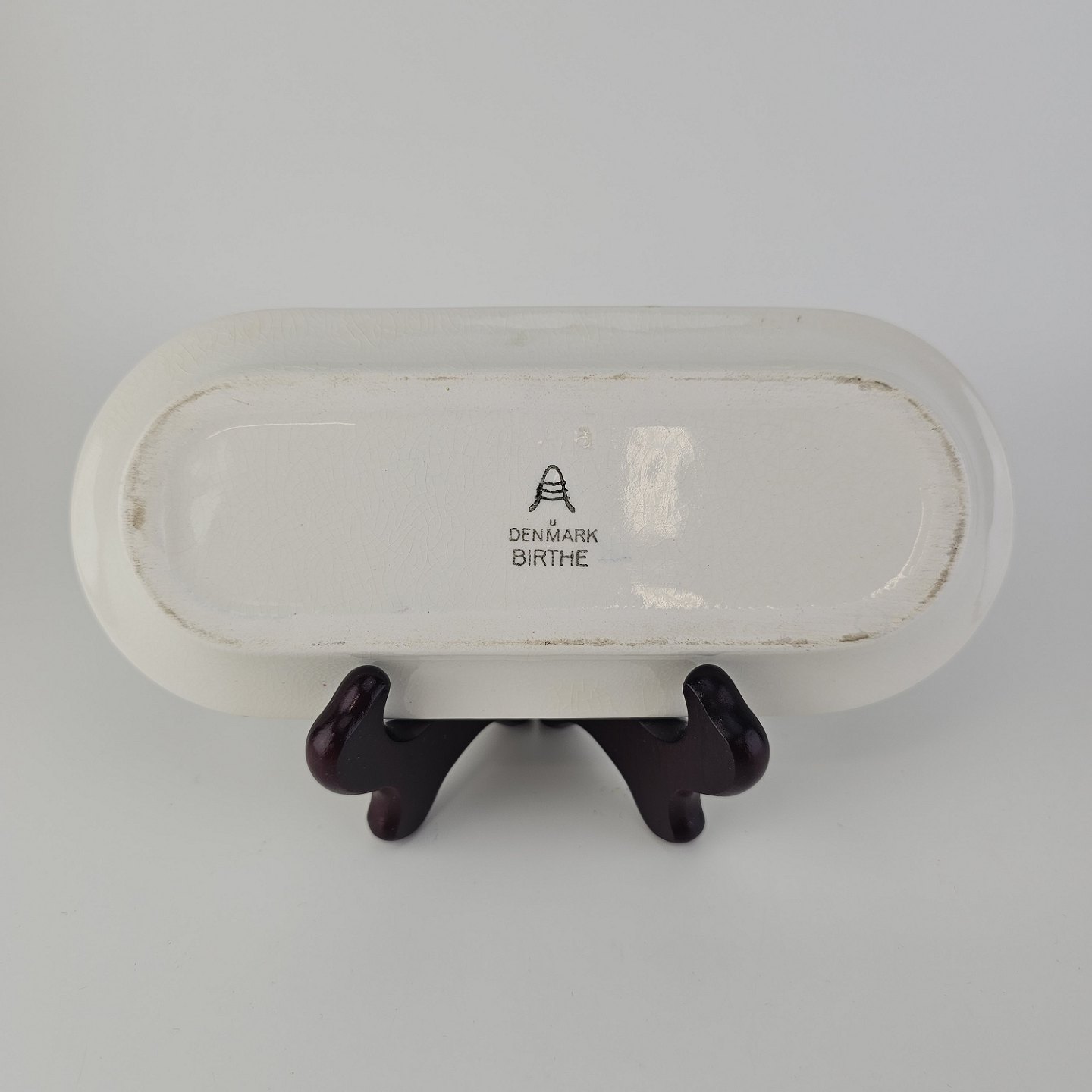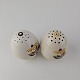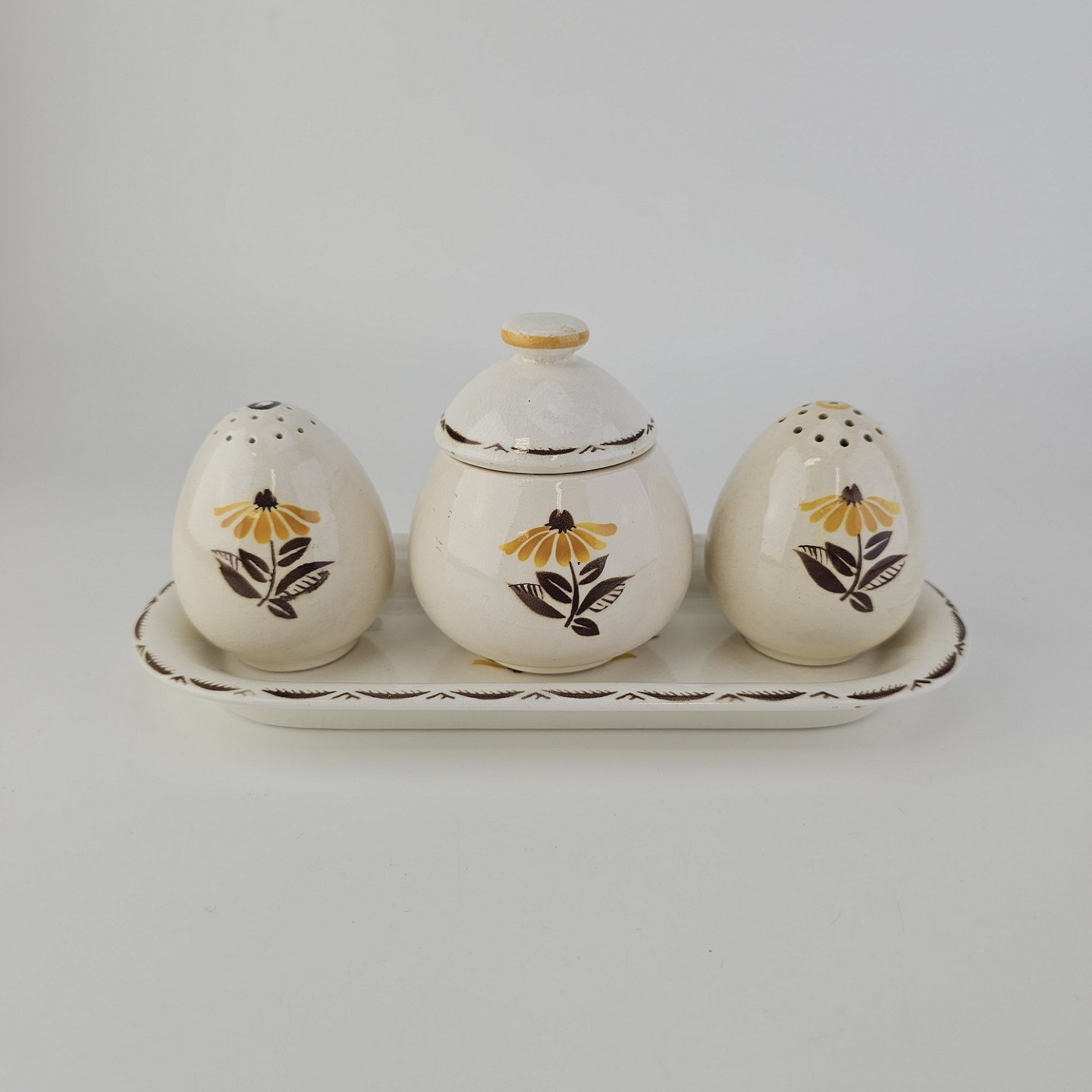 Beskrivelse: Trekantet fad med sennepskrukke, saltbøsse og peberbøsse i fajance fra stellet Birthe