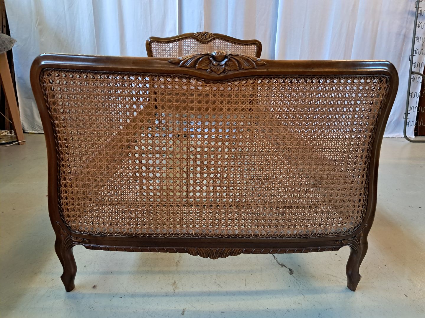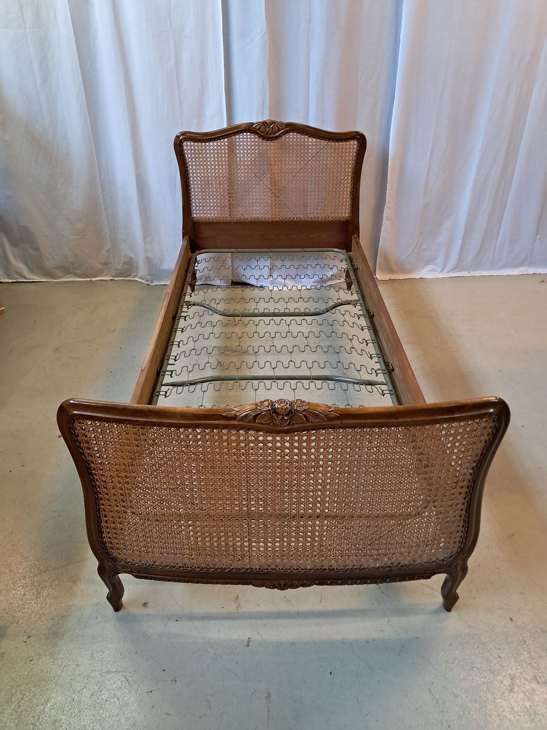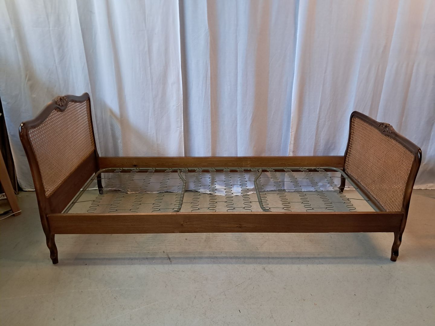 Beskrivelse: Seng i nødetræ med rørflet, fra 1950erne.