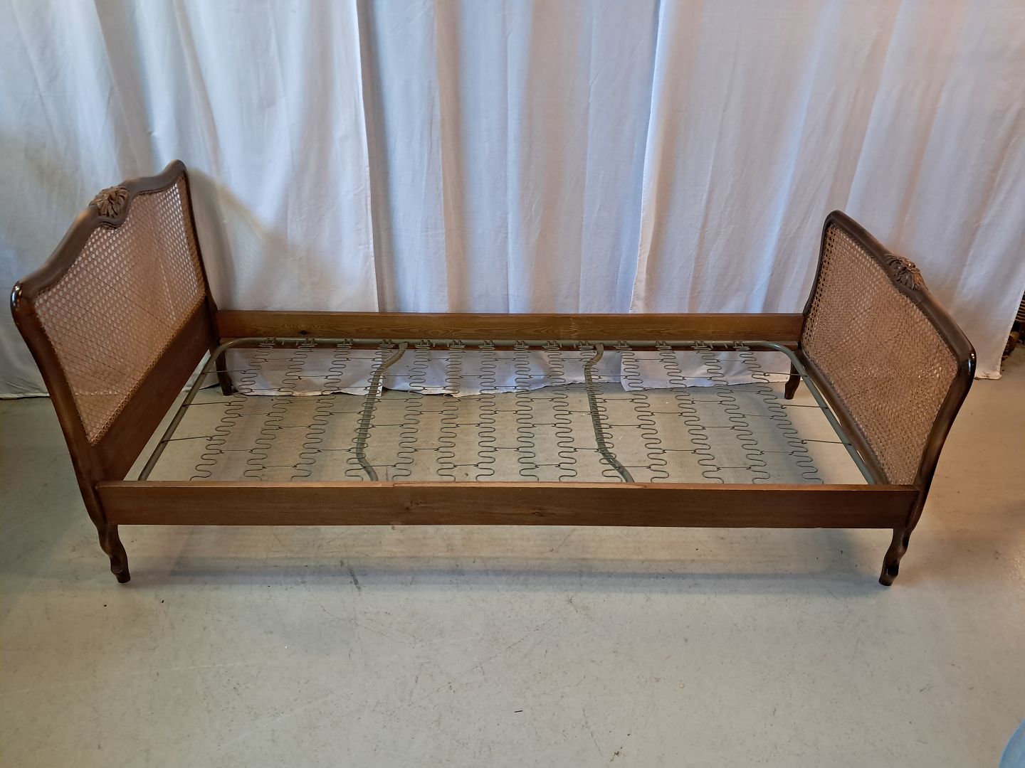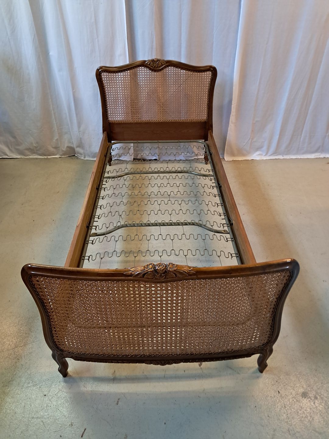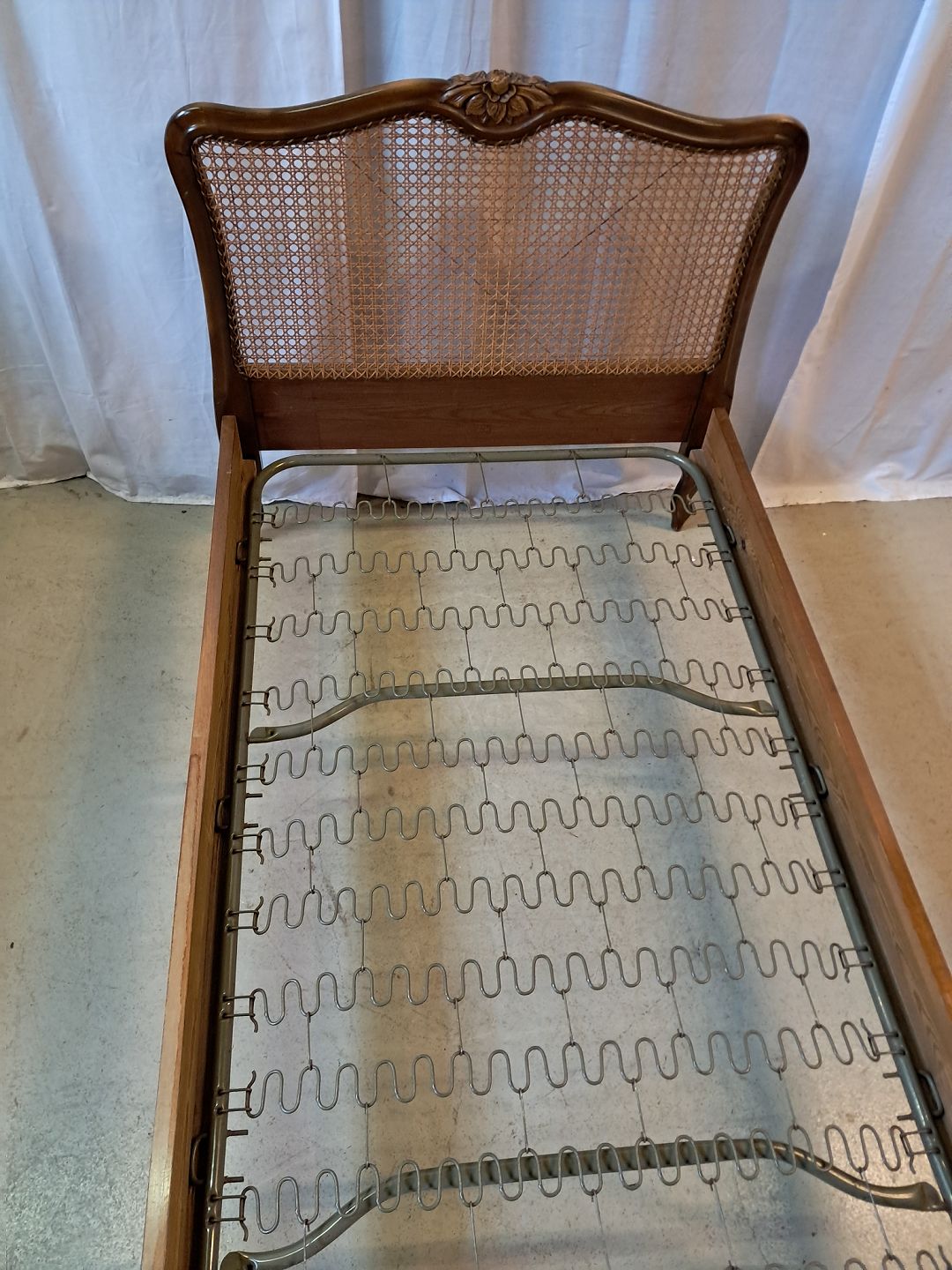 Beskrivelse: Seng i nødetræ med rørflet, fra 1950erne.