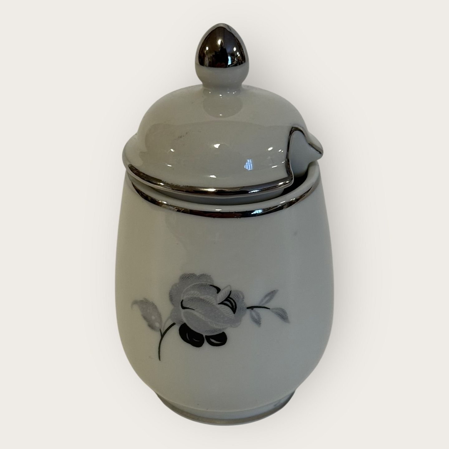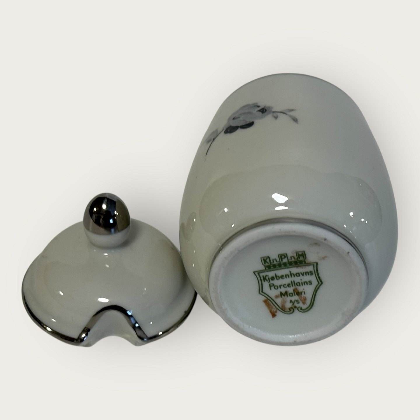 Description: Black rose, with Plantin border, KPM, Lyngby, Mustard jar, 9cm high *Good condition*
